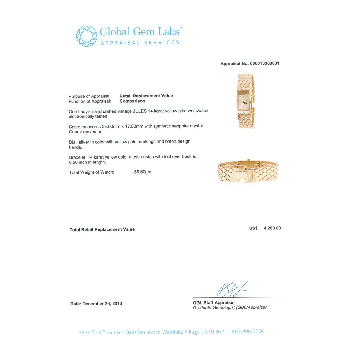 One Lady's hand crafted vintage JULES 14 karat yellow gold wristwatch electronically tested. Case: measures 25.00mm x 17.50mm with synthetic sapphire crystal. Quartz movement. Dial: silver in color with yellow gold markings and baton design hands. Bracelet: 14 karat yellow gold, mesh design with fold over buckle. 6.50 inch in length. Total Weight of Watch: 56.50gm. GGL Appraised at $4,200.00.