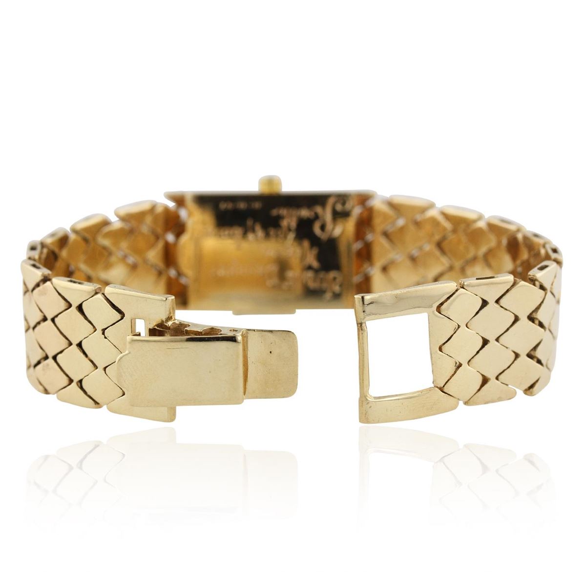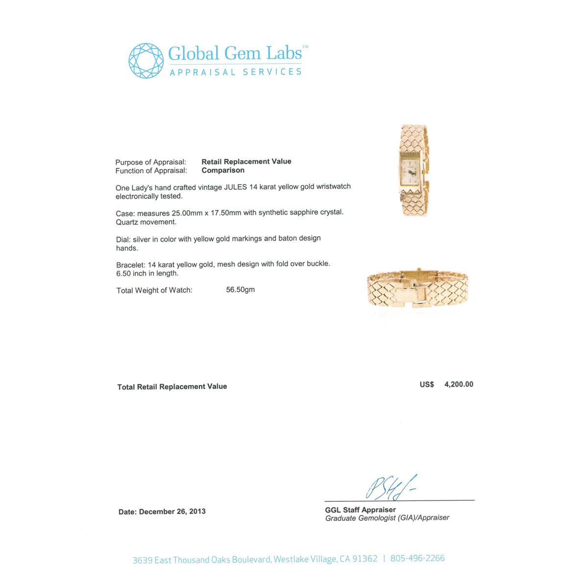 One Lady's hand crafted vintage JULES 14 karat yellow gold wristwatch electronically tested. Case: measures 25.00mm x 17.50mm with synthetic sapphire crystal. Quartz movement. Dial: silver in color with yellow gold markings and baton design hands. Bracelet: 14 karat yellow gold, mesh design with fold over buckle. 6.50 inch in length. Total Weight of Watch: 56.50gm. GGL Appraised at $4,200.00.
