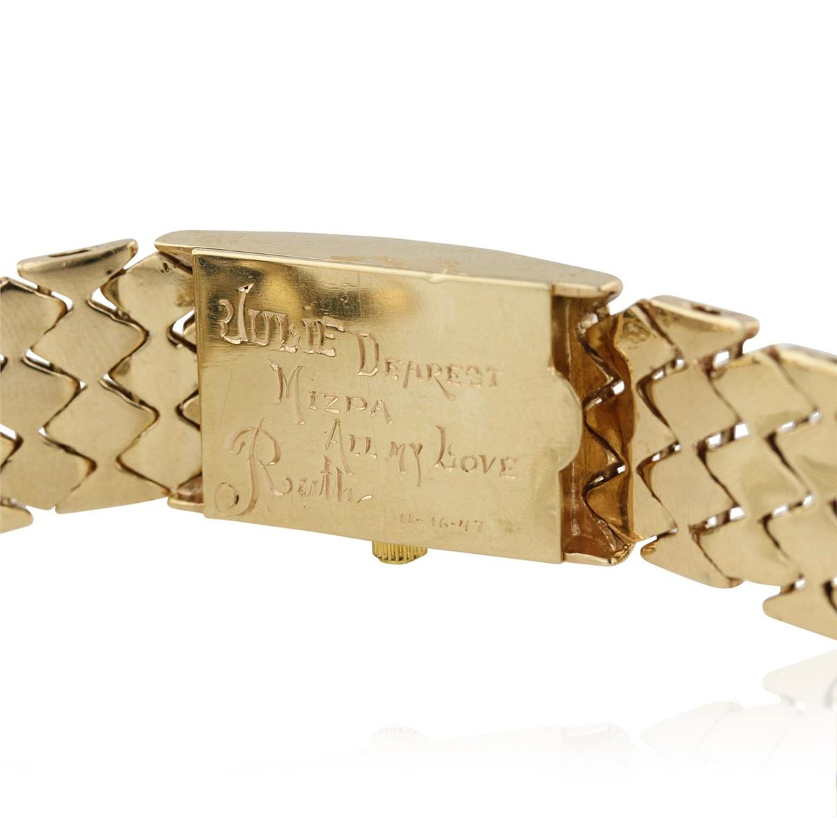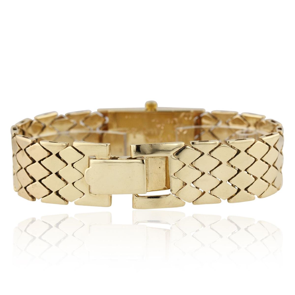 One Lady's hand crafted vintage JULES 14 karat yellow gold wristwatch electronically tested. Case: measures 25.00mm x 17.50mm with synthetic sapphire crystal. Quartz movement. Dial: silver in color with yellow gold markings and baton design hands. Bracelet: 14 karat yellow gold, mesh design with fold over buckle. 6.50 inch in length. Total Weight of Watch: 56.50gm. GGL Appraised at $4,200.00.
