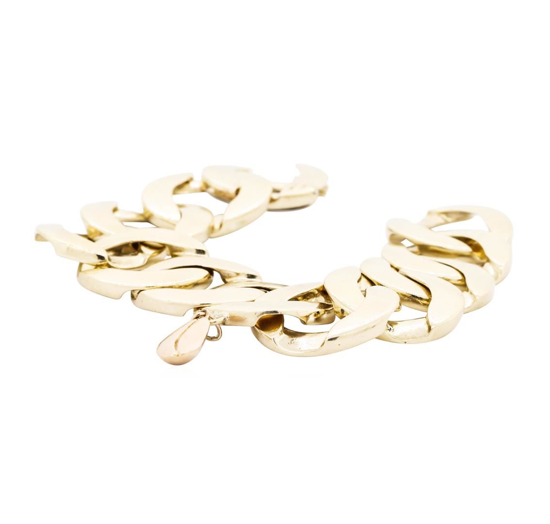 One link bracelet featuring: 14KT yellow gold weighing 107.6 grams. The bracelet has an attached 14KT rose gold bean charm and measures approximately seven and a quarter inches in length.