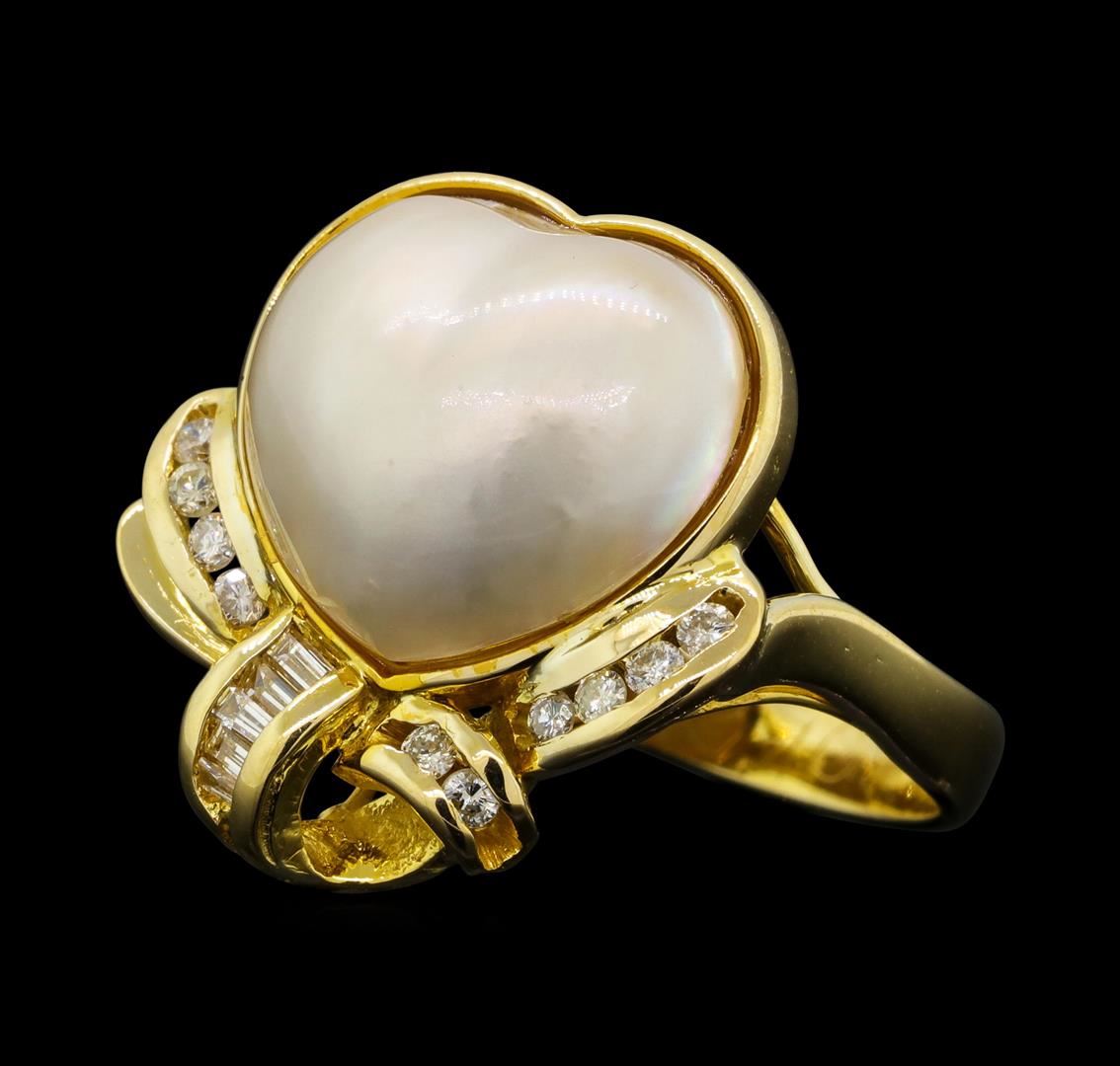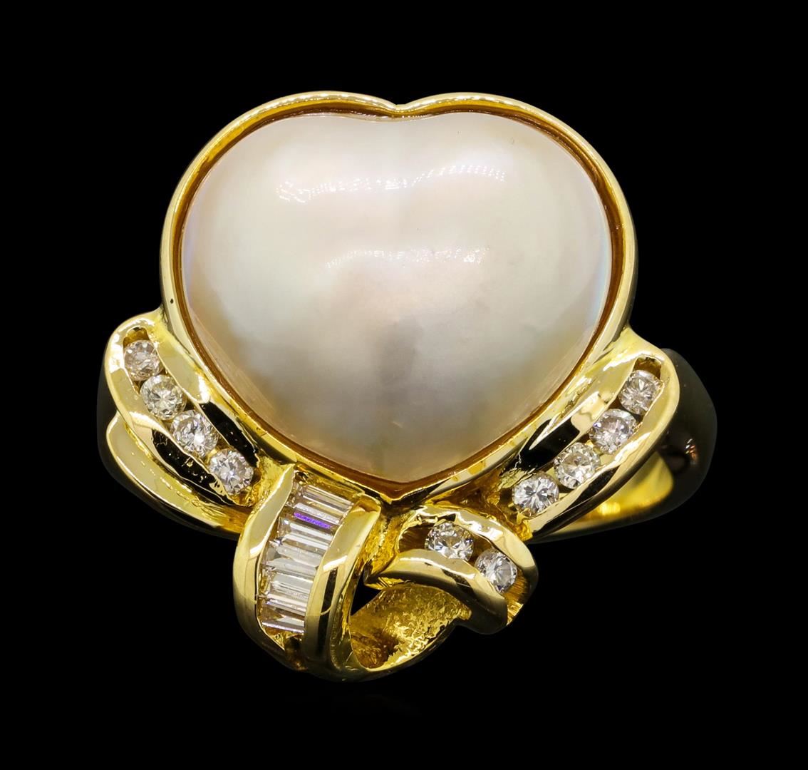 One electronically tested 14KT yellow gold lady's cast fashion heart shape ring with a bright polish finish. The featured lady's ring has a shank measuring 3.00 millimeters wide. Identified with markings of "14K". Condition is like new, good workmanship. Containing: One mabe pearl, 13.4mm to 12.4mm in size. The pearl is white in color, rosé overtone with a good luster, and mostly clean. The mabe pearl has a heart shaped motif. Graded in the setting. Ten channel set round brilliant cut diamonds, measuring 1.60 - 1.50 x 0.96mm (depth est.) approximate total weight of 10 Stones = 0.14ct. Graded in the setting. Color I - JClarity SI-1 to I-1 Cut Good Five channel set baguette cut diamonds, measuring from 1.80 x 1.00 x 0.85mm (depth est.) to 2.00 x 1.00 x 0.85mm (depth est.) approximate total weight of 5 Stones = 0.07ct. Graded in the setting. Color H - I Clarity VS-2 to SI-1 Cut Very Good. Total Weight of Diamonds 0.21ct. Total Weight of Ring 5.10gm. GAS Appraised.