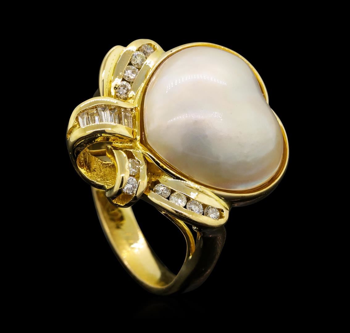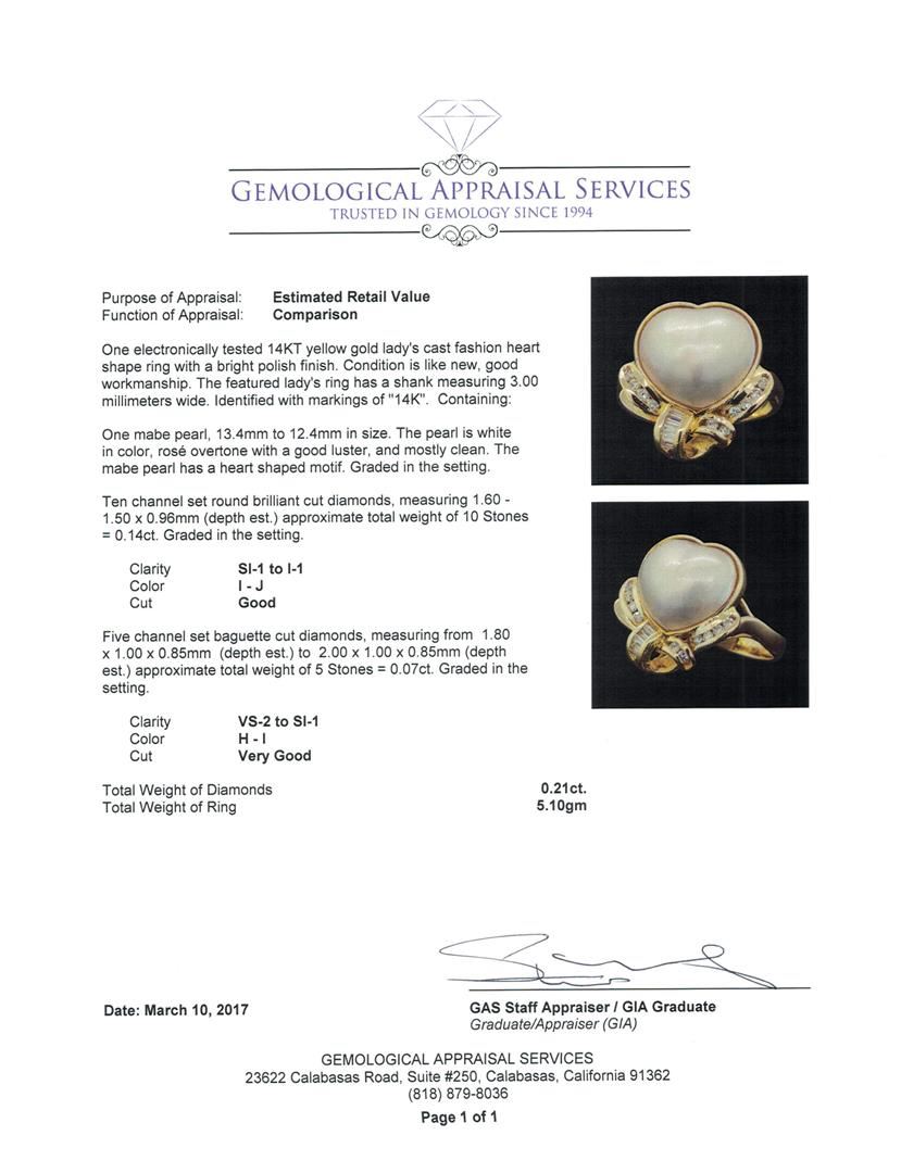 One electronically tested 14KT yellow gold lady's cast fashion heart shape ring with a bright polish finish. The featured lady's ring has a shank measuring 3.00 millimeters wide. Identified with markings of "14K". Condition is like new, good workmanship. Containing: One mabe pearl, 13.4mm to 12.4mm in size. The pearl is white in color, rosé overtone with a good luster, and mostly clean. The mabe pearl has a heart shaped motif. Graded in the setting. Ten channel set round brilliant cut diamonds, measuring 1.60 - 1.50 x 0.96mm (depth est.) approximate total weight of 10 Stones = 0.14ct. Graded in the setting. Color I - JClarity SI-1 to I-1 Cut Good Five channel set baguette cut diamonds, measuring from 1.80 x 1.00 x 0.85mm (depth est.) to 2.00 x 1.00 x 0.85mm (depth est.) approximate total weight of 5 Stones = 0.07ct. Graded in the setting. Color H - I Clarity VS-2 to SI-1 Cut Very Good. Total Weight of Diamonds 0.21ct. Total Weight of Ring 5.10gm. GAS Appraised.