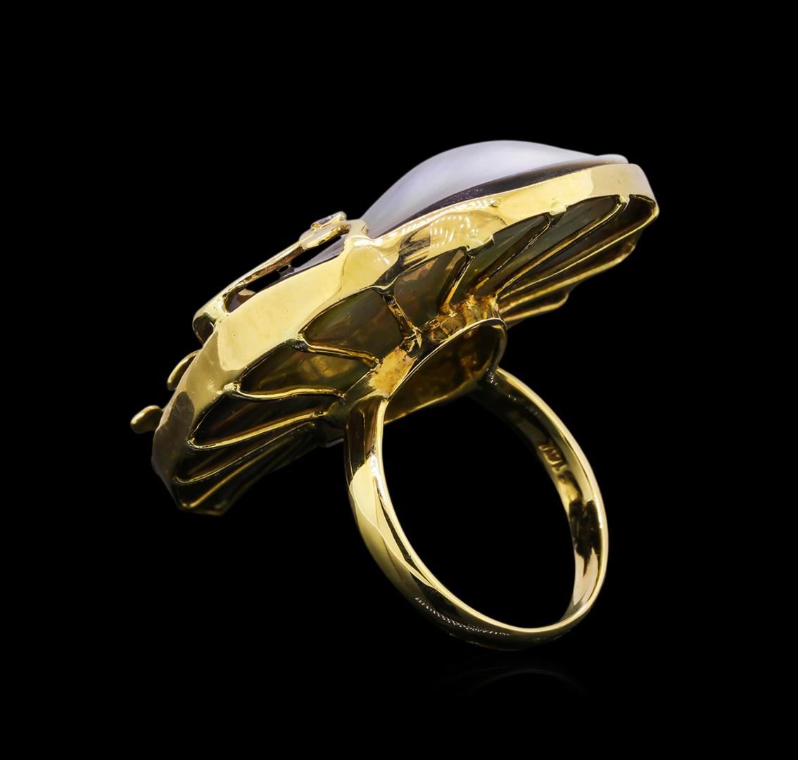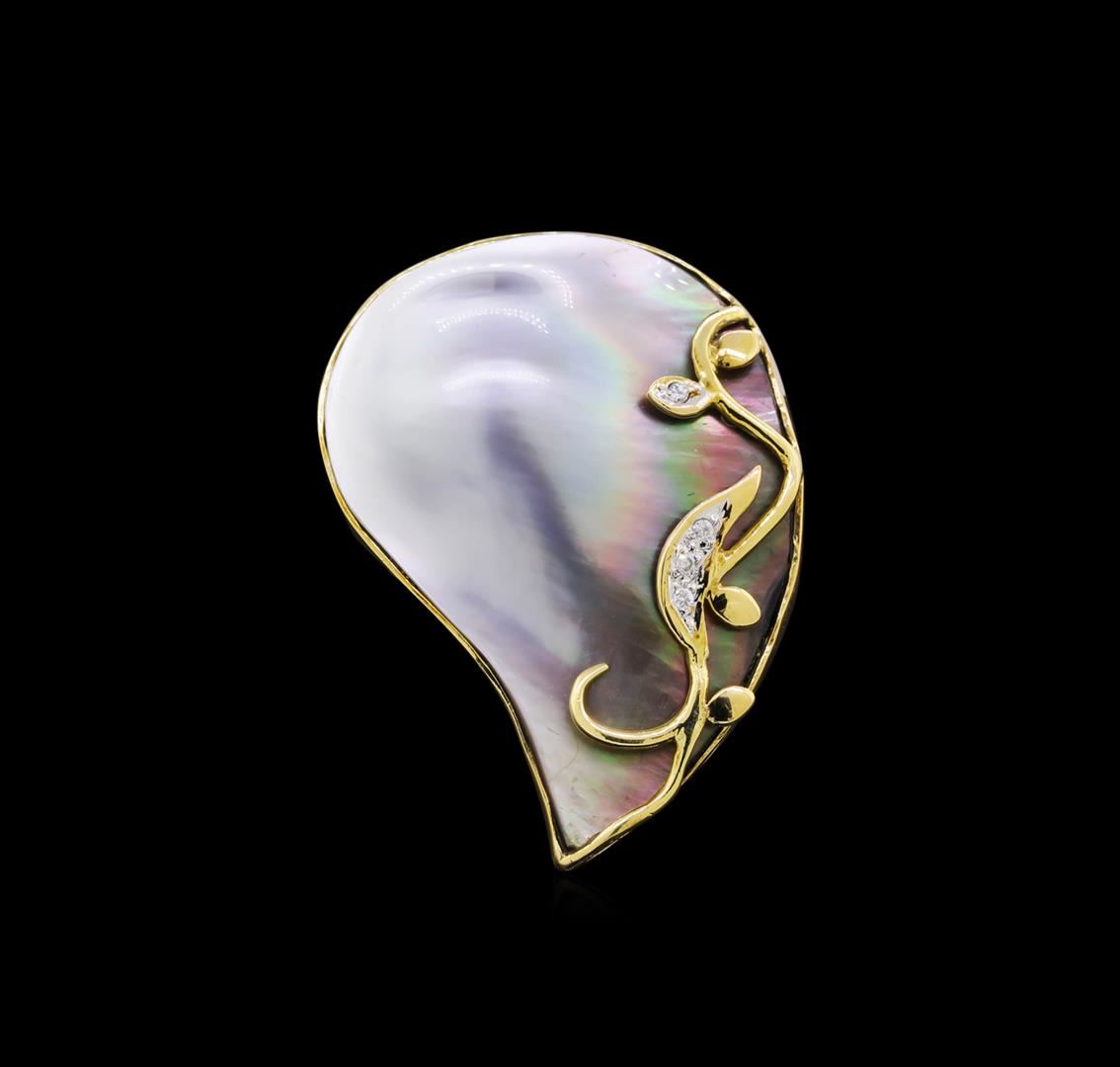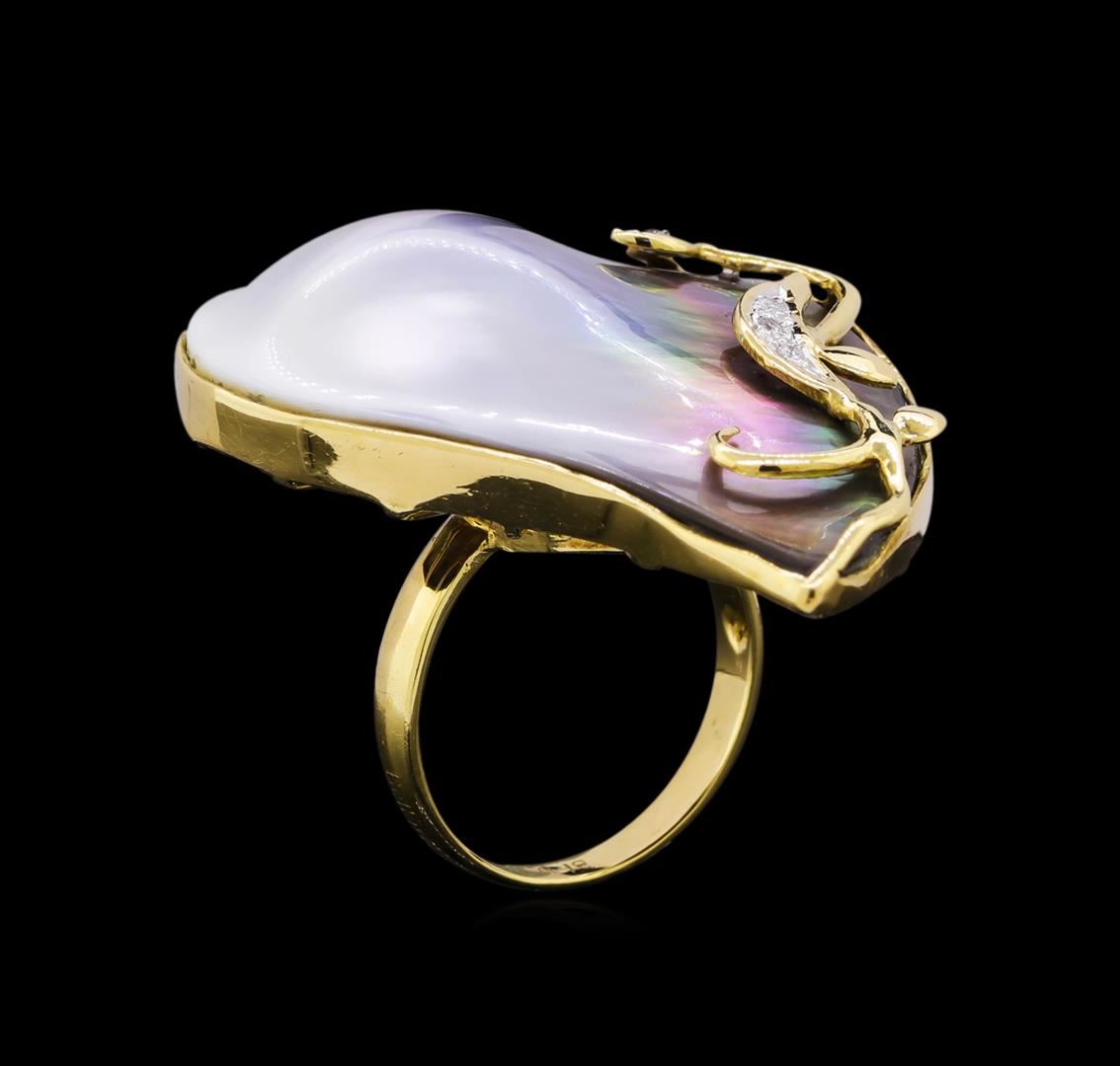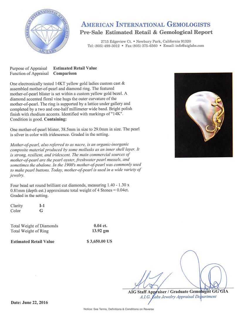 One electronically tested 14KT yellow gold ladies custom cast & assembled mother-of-pearl and diamond ring. The featured mother-of-pearl blister is set within a custom yellow gold bezel. A diamond accented floral vine hugs the outer curvature of the mother-of-pearl. The ring is supported by a lattice under gallery and completed by a two and one-half millimeter wide band. Bright polish finish with rhodium accents. Identified with markings of "14K". Condition is good. Containing: One mother of pearl pearl, 38.5mm in size to 29.0mm in size. The pearl is mu in color with a good luster, free form, clean Graded in the setting. Mother-of-pearl, also referred to as nacre, is an organic-inorganic composite material produced by some mollusks as an inner shell layer. It is strong, resilient, and iridescent. The main commercial sources of mother-of-pearl are the pearl oyster, freshwater pearl mussels, and sometimes the abalone. In the 1900's mother-of-pearl was commonly used to make pearl buttons. Today, mother-of-pearl is used in a wide variety of jewelry. Four bead set round brilliant cut diamonds, measuring 1.40 - 1.30 x 0.81mm (depth est.) approximate total weight of 4 Stones = 0.04ct. Graded in the setting. Clarity: I-1 . Color: G. Total Weight of Diamonds 0.04ct.. Total Weight of Ring 13.92gm. AIG Appraised at $3,650.00.