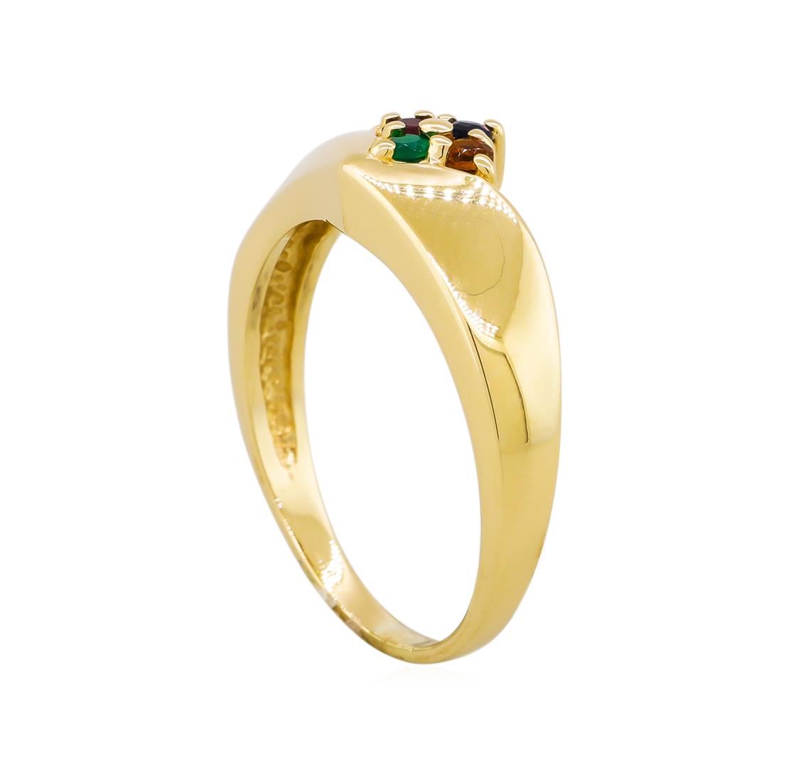 This ring is made of 14KT Yellow Gold weighing approximately 3.55 grams with markings of "14K" on the inside of the band. There is approximately 0.05ctw of multi colored gemstones with one diamond. The ring is a size 6.5.