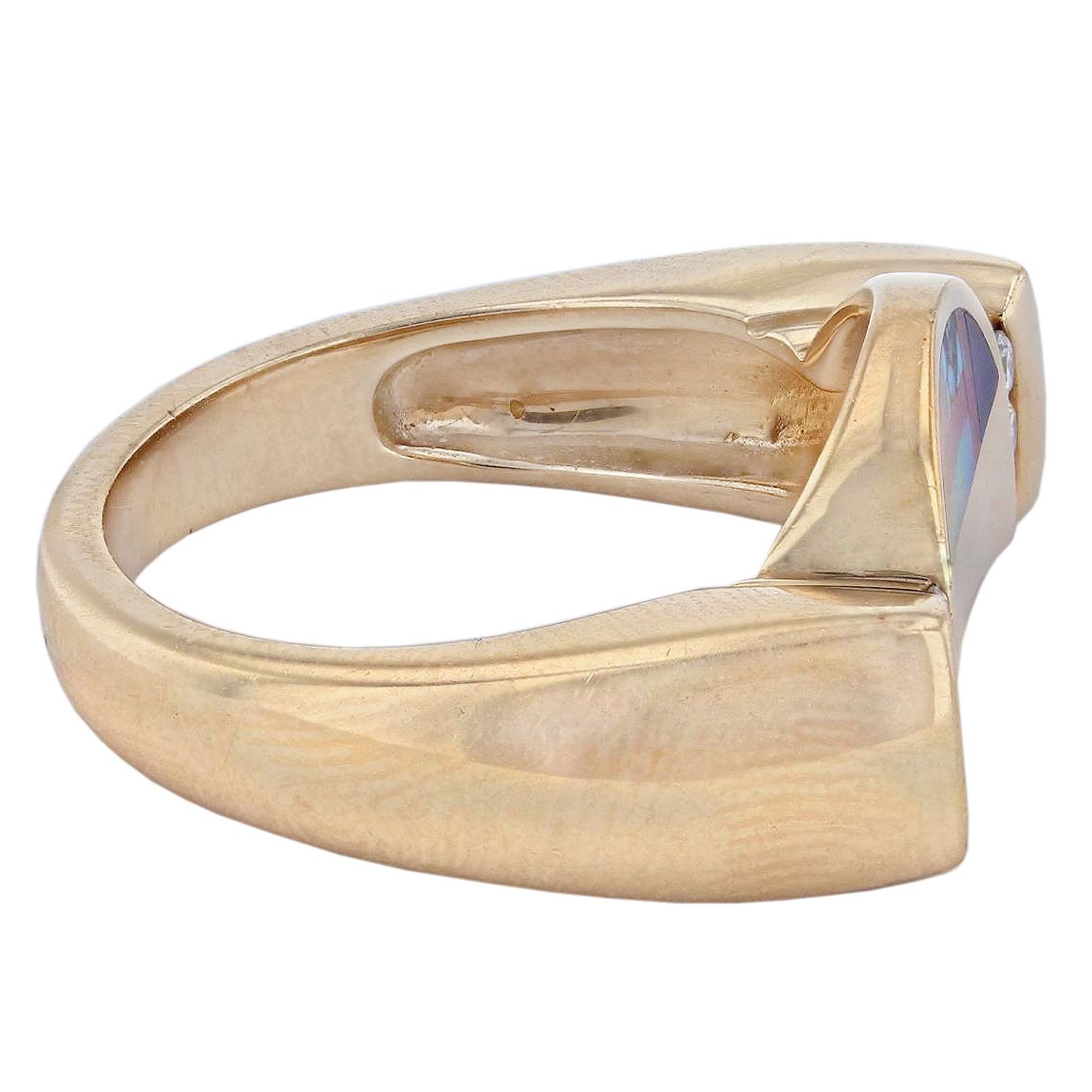 One 14KT Yellow Gold Multi Stone Diamond Ring. One electronically tested 14KT yellow gold cast diamond & multi stone inlay ring. The ring features round cut diamonds & multi-stone inlay, completed with a three millimeter wide band. Bright polish finish. Identified with markings of "14K". Condition is new, good workmanship. Containing: One free-form cut natural multi stone inlay approximate total weight of 0.00ct. Naturally occurring internal & external characteristics are present. The inlay is composed of natural coral, carnelian, turquoise, onyx & opal. Graded in the setting. Six channel set round brilliant cut diamonds, measuring 1.70 - 1.70 x 1.02mm (depth est.) approximate total weight of 6 Stones = 0.10ct. Graded in the setting. Clarity is SI-1 to I-1. Color is F - H Total Weight of Diamonds 0.10 ct. Total Weight of Ring 8.11 gm.