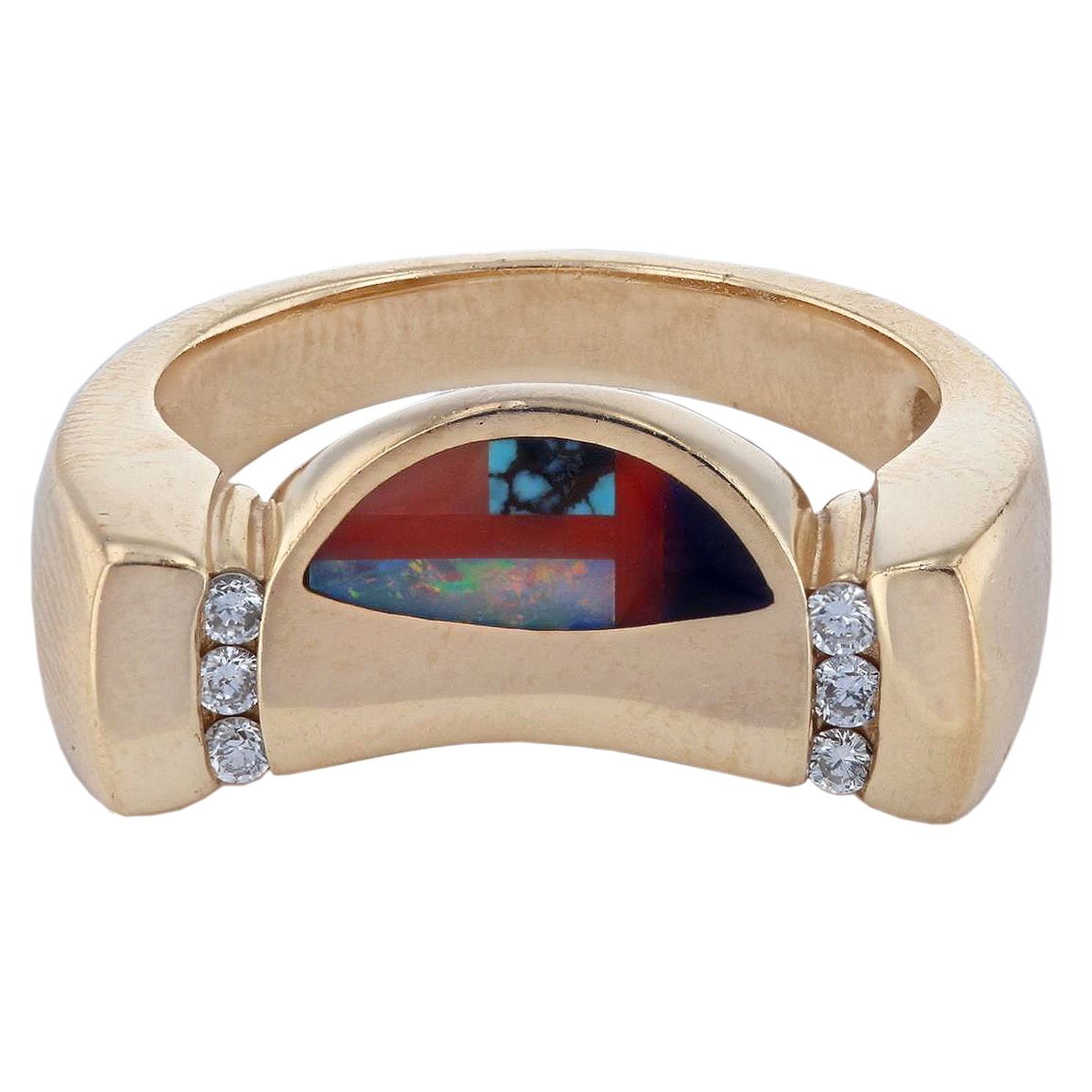 One 14KT Yellow Gold Multi Stone Diamond Ring. One electronically tested 14KT yellow gold cast diamond & multi stone inlay ring. The ring features round cut diamonds & multi-stone inlay, completed with a three millimeter wide band. Bright polish finish. Identified with markings of "14K". Condition is new, good workmanship. Containing: One free-form cut natural multi stone inlay approximate total weight of 0.00ct. Naturally occurring internal & external characteristics are present. The inlay is composed of natural coral, carnelian, turquoise, onyx & opal. Graded in the setting. Six channel set round brilliant cut diamonds, measuring 1.70 - 1.70 x 1.02mm (depth est.) approximate total weight of 6 Stones = 0.10ct. Graded in the setting. Clarity is SI-1 to I-1. Color is F - H Total Weight of Diamonds 0.10 ct. Total Weight of Ring 8.11 gm.
