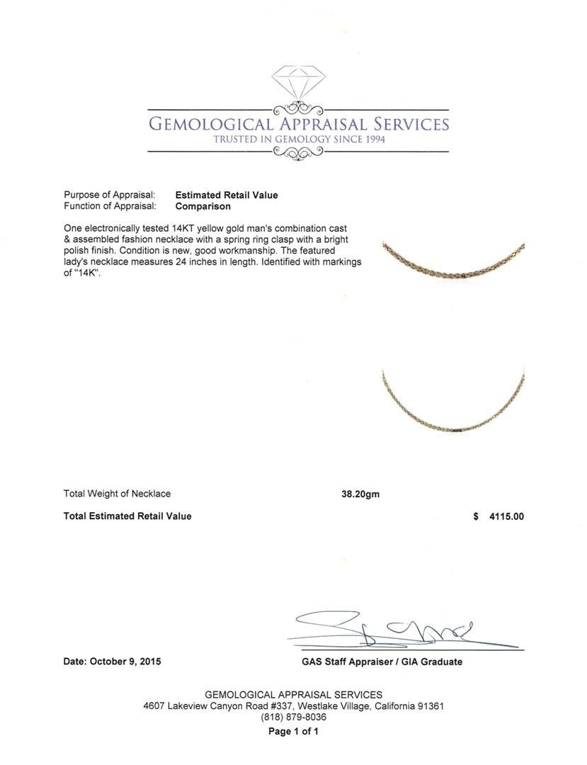 One electronically tested 14KT yellow gold man's combination cast & assembled fashion necklace with a spring ring clasp with a bright polish finish. The featured lady's necklace measures 24 inches in length. Identified with markings of "14K". Condition is new, good workmanship. Total Weight of Necklace 38.20gm. GAS Appraised at $4,115.00.