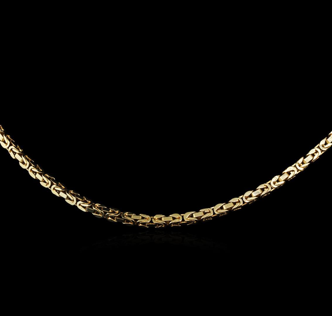 One electronically tested 14KT yellow gold man's combination cast & assembled fashion necklace with a spring ring clasp with a bright polish finish. The featured lady's necklace measures 24 inches in length. Identified with markings of "14K". Condition is new, good workmanship. Total Weight of Necklace 38.20gm. GAS Appraised at $4,115.00.