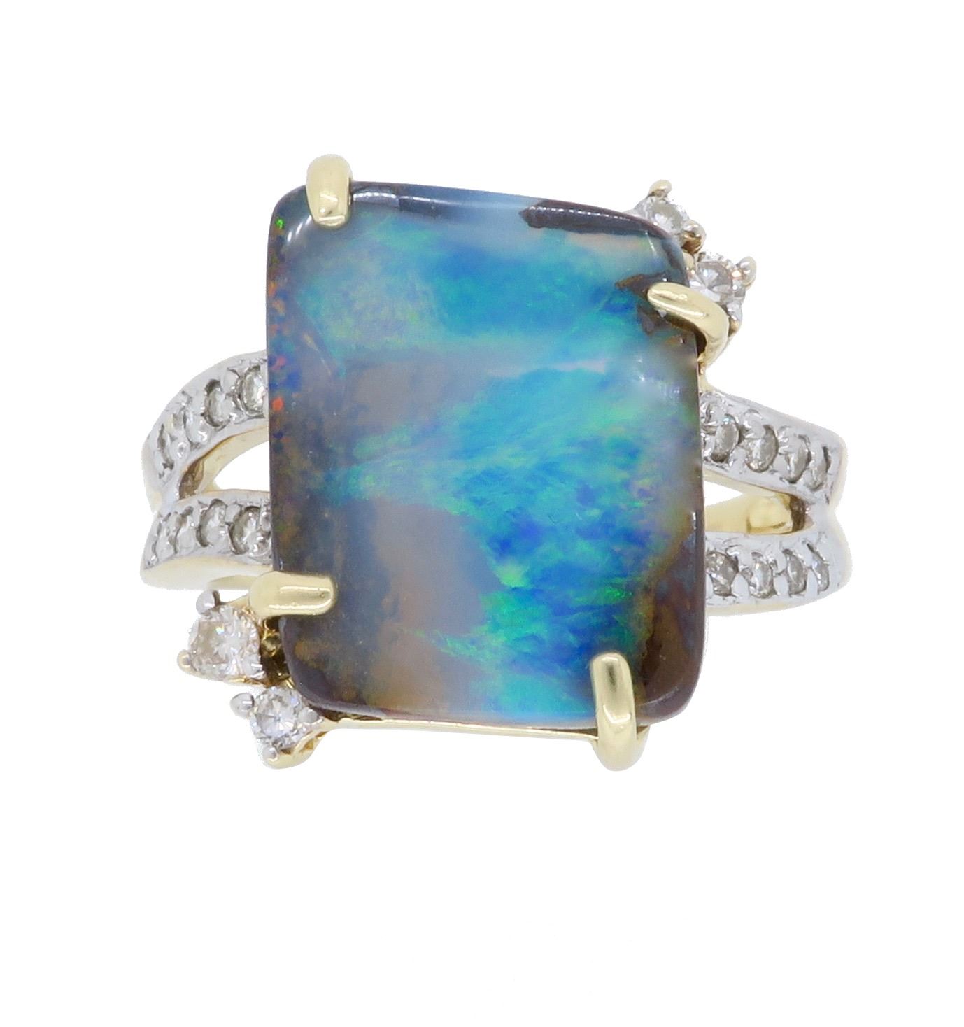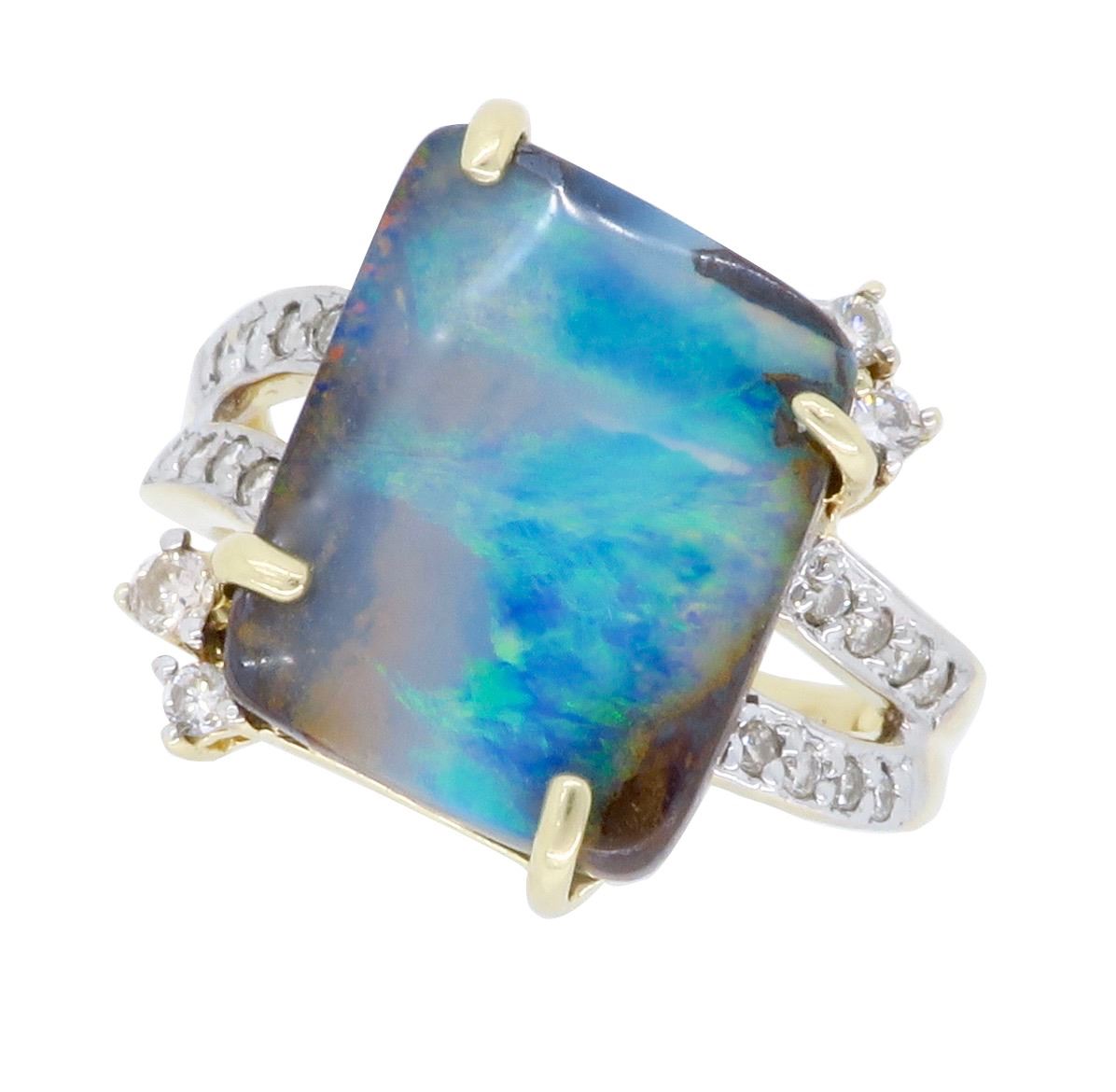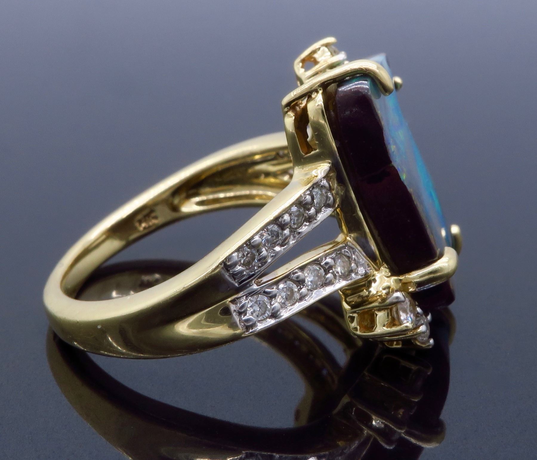 One 14KT Yellow Gold Opal and Diamond Ring. (1) Opal measuring 14.25mm x 11.45mm. Round Diamonds with a total weight of 0.25cts. Total weight of this ring is 5.6 grams.