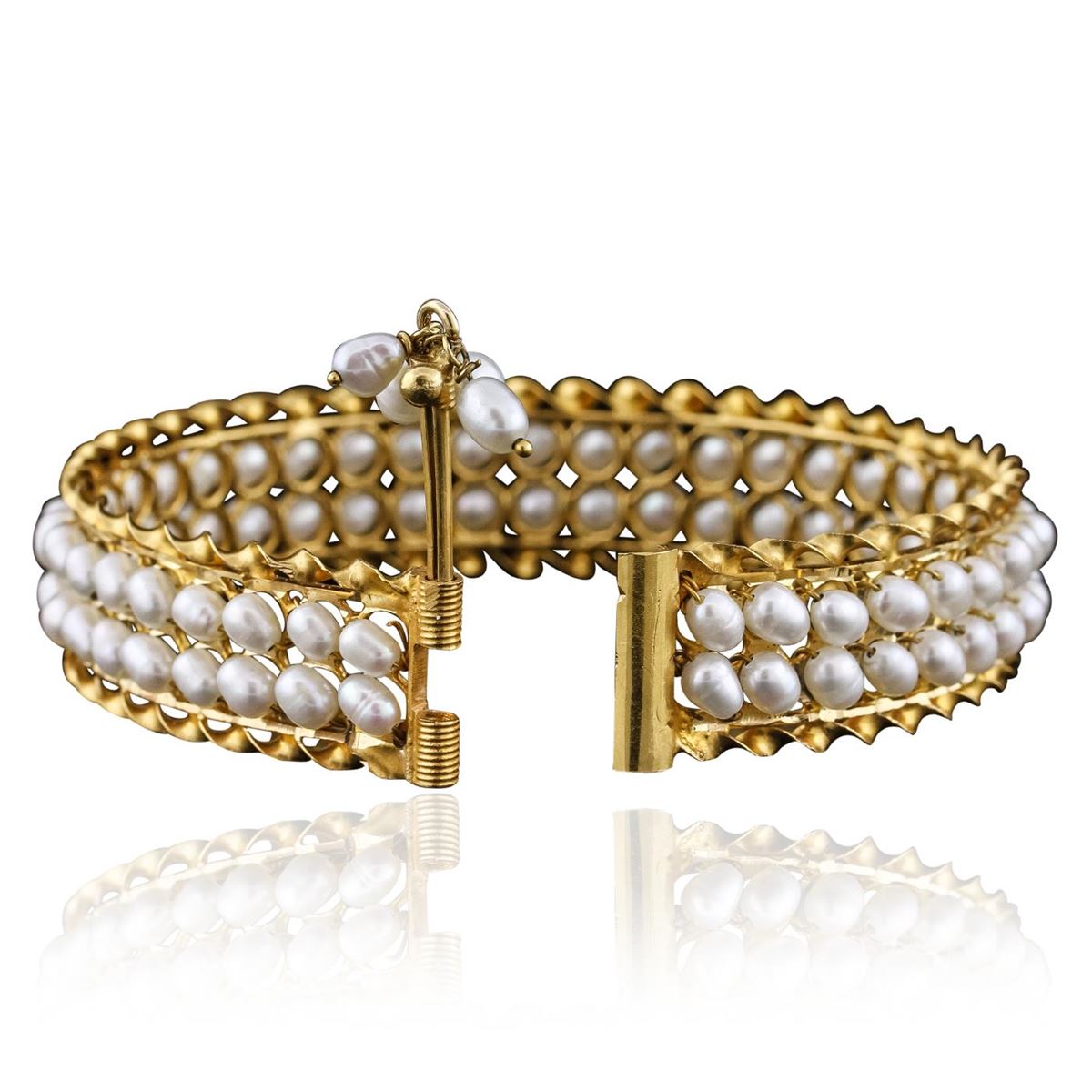 One bangle featuring: 14KT Yellow Gold with a total weight of 30.20 grams, and Pearls.