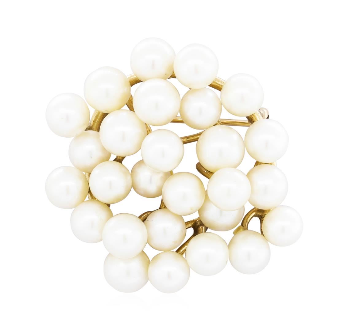 One pearl brooch featuring: 14KT yellow gold weighing 15.6 grams containing 27 Akoya cultured pearls.