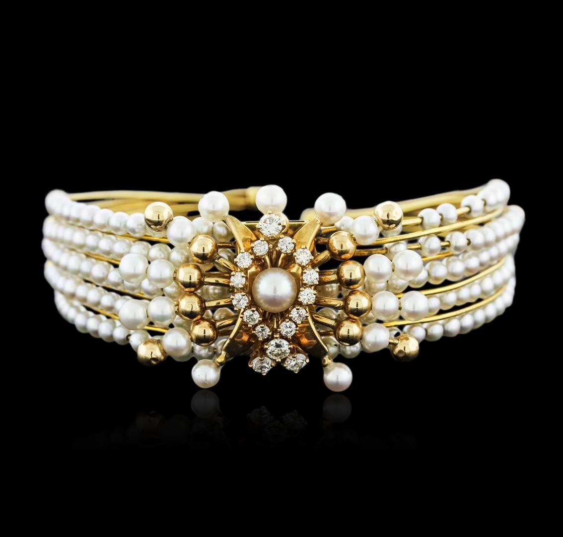 One electronically tested 14KT yellow gold ladies custom hand made pearl and diamond bangle bracelet with a antiqued finish. Condition is very good. Containing: 148 Chinese freshwater pearls, 3.0mm in size to 5.8mm in size. The pearls are white in color with a good luster, round, lightly blemished. Sixteen prong set round brilliant cut diamonds, measuring 2.90 - 2.10 x 1.50mm (depth est.) approximate total weight of 16 Stones = 0.40ct. Clarity: SI-1 to SI-2. Color: K - L, Cut is Good. Colored gemstones are presumed to have been subjected to commonly used enhancement processes. All diamonds and colored gemstones are graded in the mounting, unless otherwise stated. Total Weight of Diamonds 0.40ct. Total Weight of Bangle Bracelet 34.40 grams. GGL Appraised at $6,605.00.