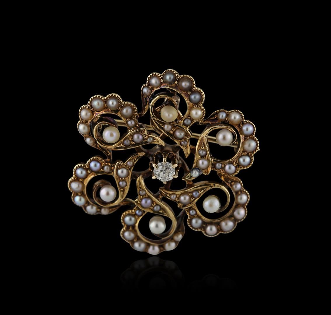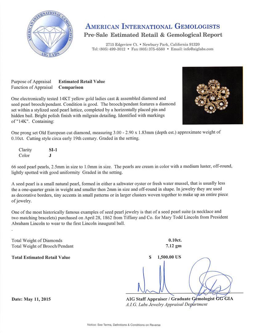 One electronically tested 14KT yellow gold ladies cast & assembled diamond and seed pearl brooch/pendant. The brooch/pendant features a diamond set within a stylized seed pearl lattice, completed by a horizontally placed pin and hidden bail. Bright polish finish with milgrain detailing. Identified with markings of "14K". Condition is good. Containing: One prong set Old European cut diamond, measuring 3.00 - 2.90 x 1.83mm (depth est.) approximate weight of 0.10ct. Cutting style circa early 19th century. Graded in the setting. Clarity: SI-1. Color: J 66 seed pearl pearls, 2.5mm in size to 1.0mm in size. The pearls are cream in color with a medium luster, off-round, lightly spotted with good uniformity Graded in the setting. A seed pearl is a small natural pearl, formed in either a saltwater oyster or fresh water mussel, that is usually less the a one-quarter grain in weight and smaller then 2mm in size and off-round in shape. In jewelry they are used as decorative borders, tiny accents in small patterns or in larger clusters woven together to make up an entire piece of jewelry. One of the most historically famous examples of seed pearl jewelry is that of a seed pearl suite (a necklace and two matching bracelets) purchased on April 28, 1862 from Tiffany and Co. for Mary Todd Lincoln from President Abraham Lincoln to wear to the first Lincoln inaugural ball. Total Weight of Diamonds 0.10ct. AIG Appraised at $1,500.00.