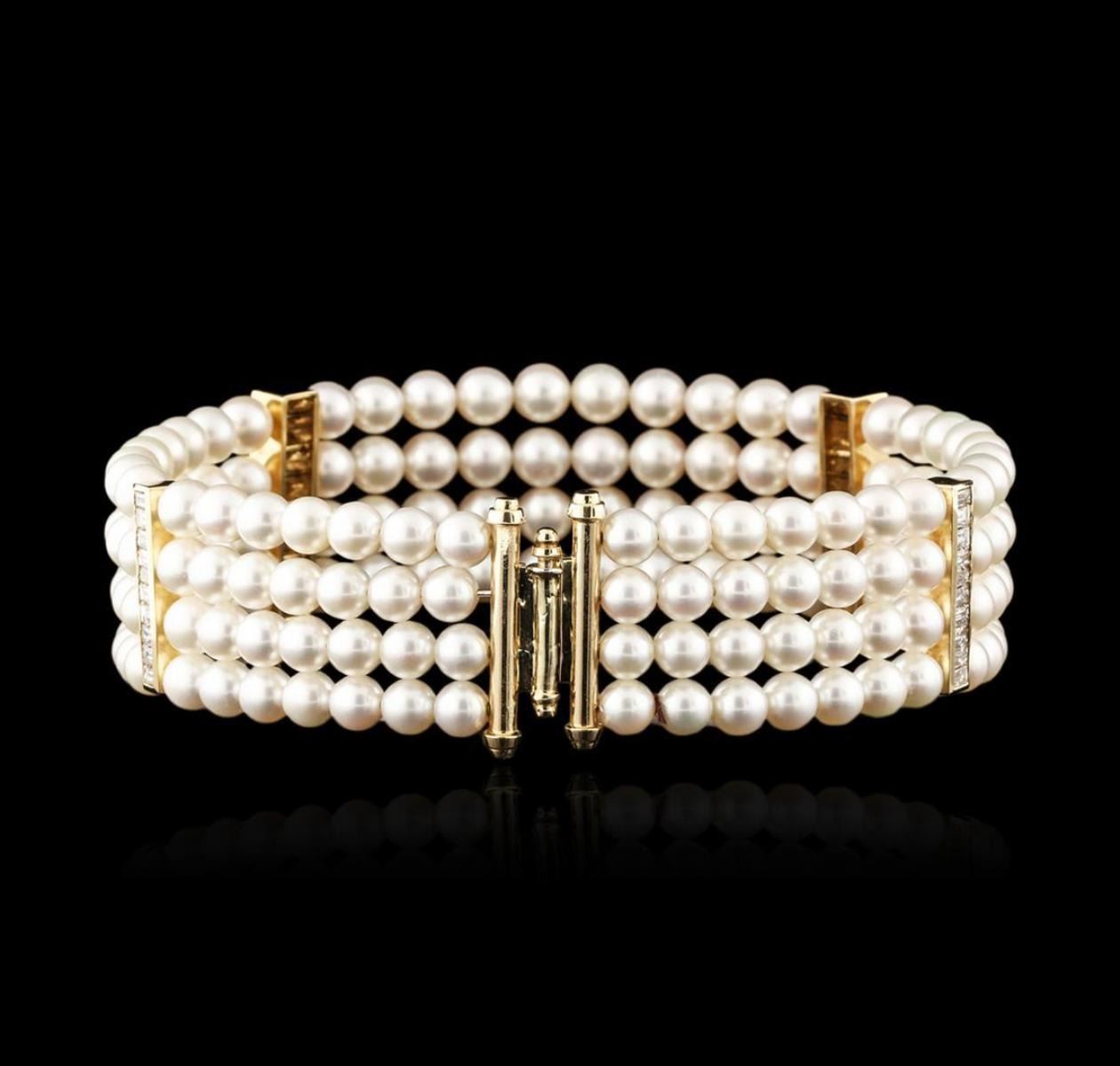 One electronically tested 14KT yellow gold ladies cast & assembled akoya cultured pearl and diamond choker. The twelve inch wearable length choker features a one and one-quarter inch wide four row akoya cultured pearl ribbon with four 14KT yellow gold diamond spacer bars, terminating in a 14KT yellow gold plunger style clasp. Bright polish finish. Condition is good. Containing: 160 akoya cultured pearls, 6.5mm in size to 7.0mm in size. The pearls are cream rose' in color with a high luster, thick nacre, all round, lightly spotted with good uniformity Graded in the setting. Akoya Cultured Pearls are farmed in the ocean waters around the countries of Japan and China. In Japan the main culturing areas are near Ehime, Kumamoto, and Nagasaki. In China, the main culturing areas are Hainan Island, Chenghai Guangdong, and Liusha Zhangjiang. Liusha is known in China as the Country of Akoya Pearls. The Akoya oyster Pinctada Fucata Martensii is the smallest pearl-producing oyster. The cultured pearl is produced by inserting a nuclei and a small piece of mantle tissue into the oyster. Akoya pearls tend to range in size from about 4 to 8 millimeters and consistently are round and or near-round. The Akoya pearl takes from two to three years to form. Akoya pearls are the pearls most often used in necklaces. They are generally white or cream colored, and have overtones of rose, pink, cream, and or green. The development of the modern pearl culturing technique is due to the work of one man, Kokichi Mikimoto who began work on this idea in the late 19th century. The Japanese Akoya cultured pearl became the first pearl to be cultured in a steady reliable production. Forty-Two channel set baguette cut diamonds, measuring from 4.40 x 2.30 x 1.61mm (depth est.) to 4.60 x 2.50 x 1.75mm (depth est.) approximate total weight of 42 Stones = 6.97ct. Graded in the setting. Clarity: VVS-2 to VS-2. Color: F - H. Total Weight of Diamonds 6.97ct. Total Weight of Choker121.73 grams. AIG Appraised.