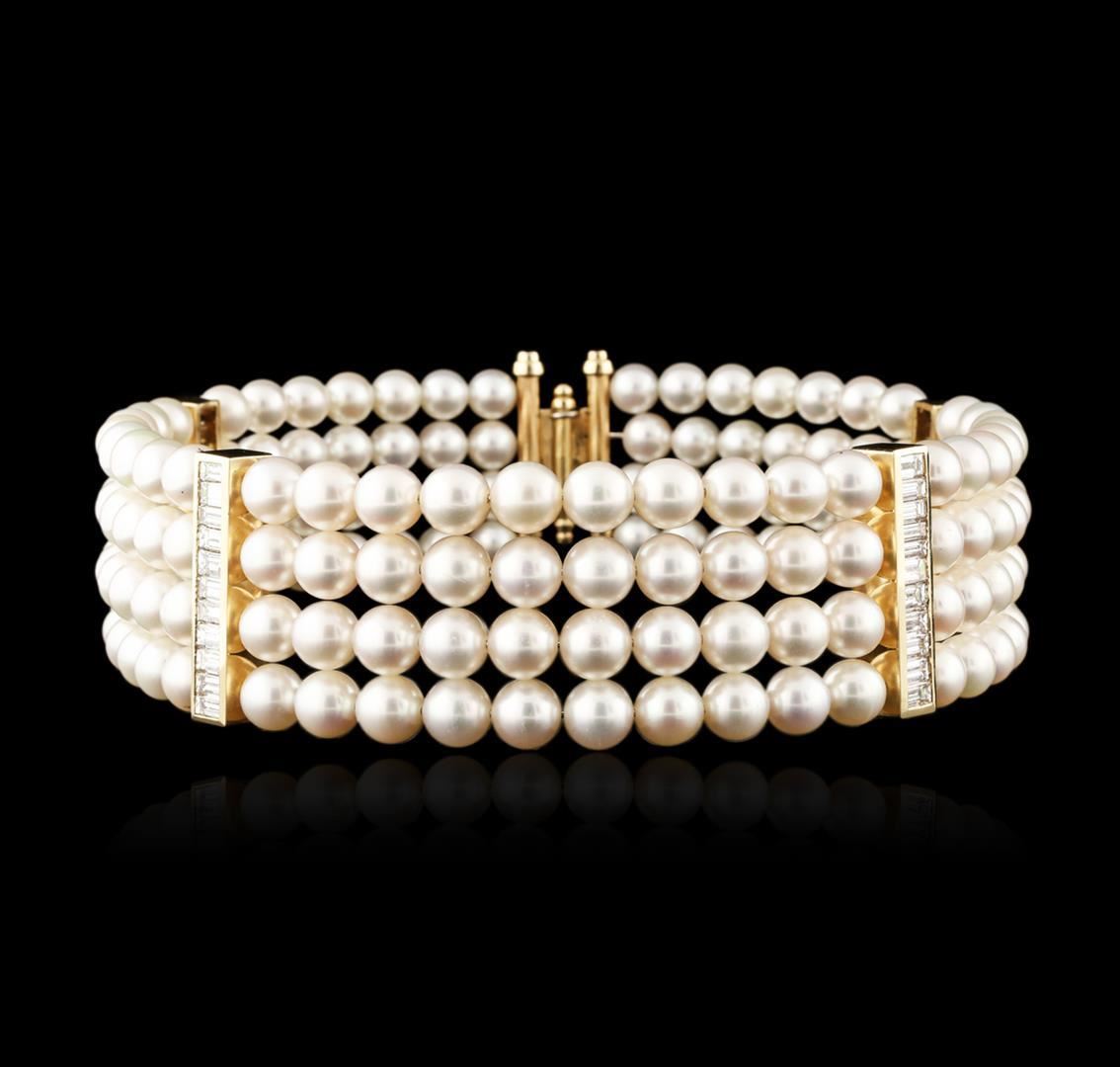 One electronically tested 14KT yellow gold ladies cast & assembled akoya cultured pearl and diamond choker. The twelve inch wearable length choker features a one and one-quarter inch wide four row akoya cultured pearl ribbon with four 14KT yellow gold diamond spacer bars, terminating in a 14KT yellow gold plunger style clasp. Bright polish finish. Condition is good. Containing: 160 akoya cultured pearls, 6.5mm in size to 7.0mm in size. The pearls are cream rose' in color with a high luster, thick nacre, all round, lightly spotted with good uniformity Graded in the setting. Akoya Cultured Pearls are farmed in the ocean waters around the countries of Japan and China. In Japan the main culturing areas are near Ehime, Kumamoto, and Nagasaki. In China, the main culturing areas are Hainan Island, Chenghai Guangdong, and Liusha Zhangjiang. Liusha is known in China as the Country of Akoya Pearls. The Akoya oyster Pinctada Fucata Martensii is the smallest pearl-producing oyster. The cultured pearl is produced by inserting a nuclei and a small piece of mantle tissue into the oyster. Akoya pearls tend to range in size from about 4 to 8 millimeters and consistently are round and or near-round. The Akoya pearl takes from two to three years to form. Akoya pearls are the pearls most often used in necklaces. They are generally white or cream colored, and have overtones of rose, pink, cream, and or green. The development of the modern pearl culturing technique is due to the work of one man, Kokichi Mikimoto who began work on this idea in the late 19th century. The Japanese Akoya cultured pearl became the first pearl to be cultured in a steady reliable production. Forty-Two channel set baguette cut diamonds, measuring from 4.40 x 2.30 x 1.61mm (depth est.) to 4.60 x 2.50 x 1.75mm (depth est.) approximate total weight of 42 Stones = 6.97ct. Graded in the setting. Clarity: VVS-2 to VS-2. Color: F - H. Total Weight of Diamonds 6.97ct. Total Weight of Choker121.73 grams. AIG Appraised.