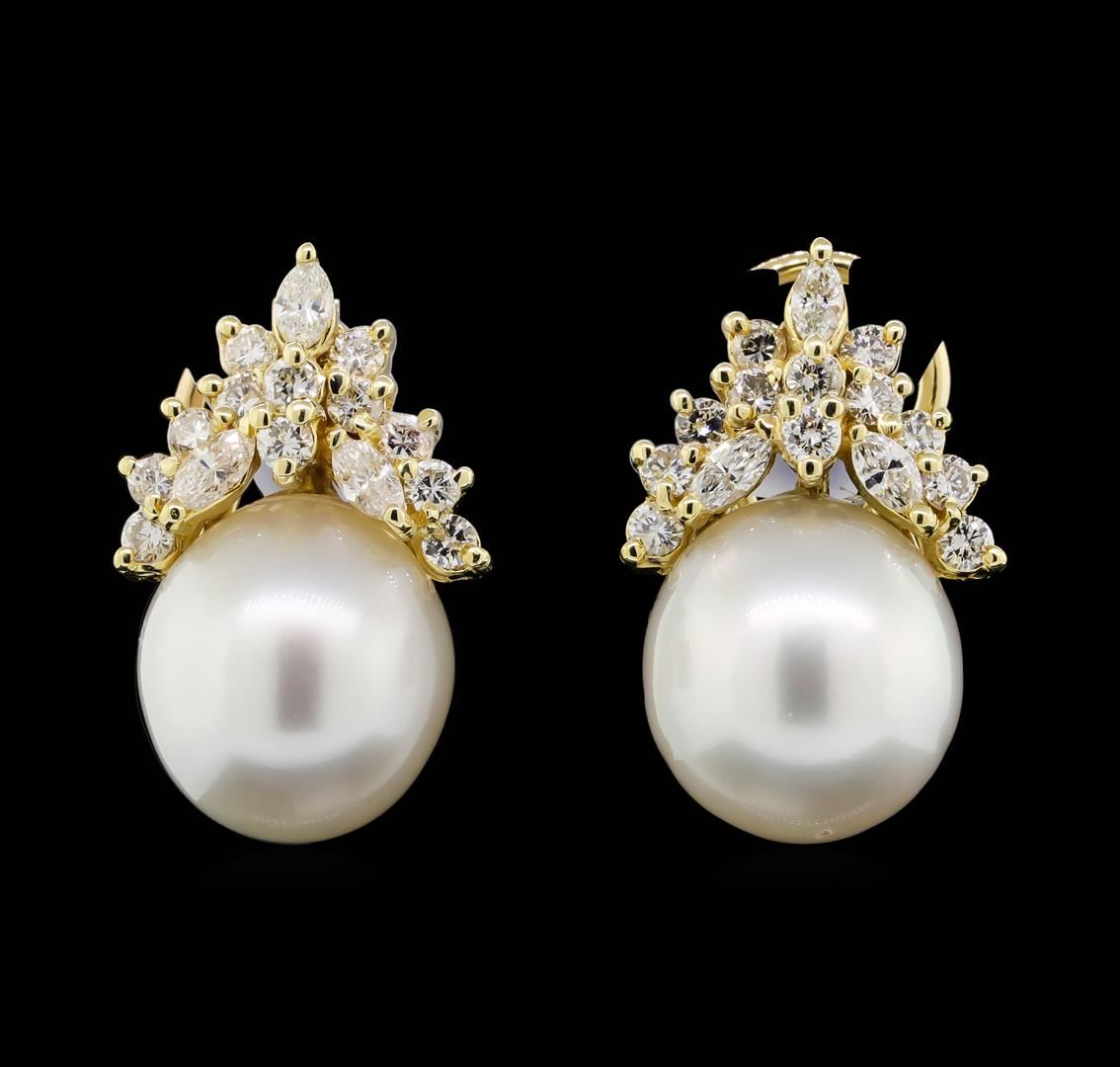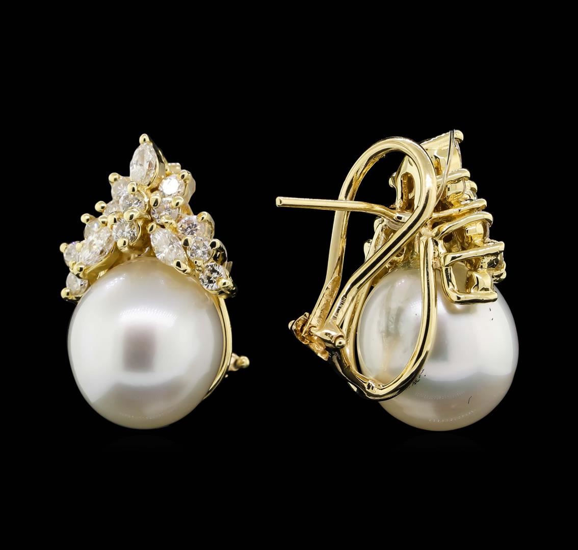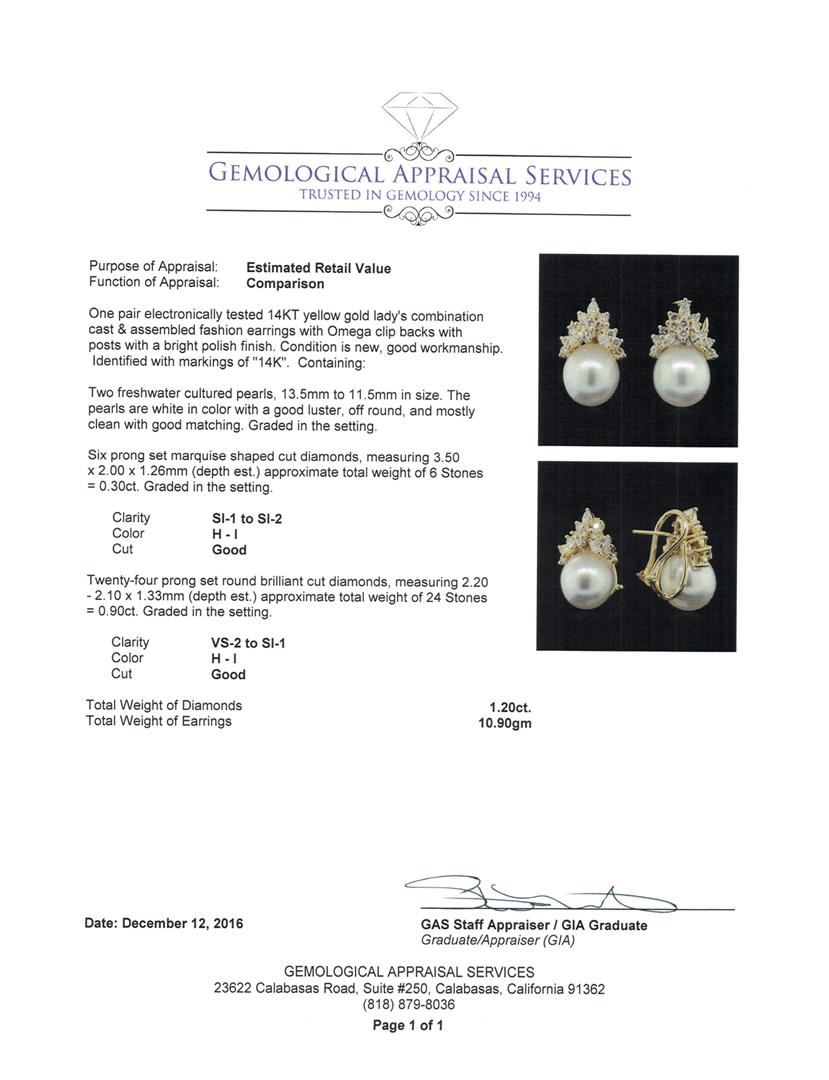 One pair electronically tested 14KT yellow gold lady's combination cast & assembled fashion earrings with Omega clip backs with posts with a bright polish finish. Identified with markings of "14K". Condition is new, good workmanship. Containing: Two freshwater cultured pearls, 13.5mm to 11.5mm in size. The pearls are white in color with a good luster, off round, and mostly clean with good matching. Graded in the setting. Six prong set marquise shaped cut diamonds, measuring 3.50 x 2.00 x 1.26mm (depth est.) approximate total weight of 6 Stones = 0.30ct. Graded in the setting. Clarity: SI-1 to SI-2. Color: H - ICut Good Twenty-Four prong set round brilliant cut diamonds, measuring 2.20 - 2.10 x 1.33mm (depth est.) approximate total weight of 24 Stones = 0.90ct. Graded in the setting. Clarity: VS-2 to SI-1. Color: H - ICut Good. Total Weight of Diamonds 1.20ct. Total Weight of Earrings 10.90gm. GAS Appraised.