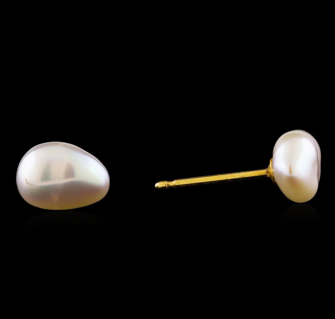 One set electronically tested 14KT yellow gold ladies cast pearl and diamond 4 piece suite with a bright polish finish. Identified with markings of "14K". Condition is new. Containing: Four mabe pearls, 16.4mm in size to 19.4mm in size. The pearls are white in color with a good luster, lightly blemished. Two Chinese freshwater pearls, 7.6mm in size to 5.5mm in size. The pearls are white in color with a good luster, baroque, moderately blemished. One prong set round brilliant cut diamond, measuring 2.00 - 2.00 x 1.20mm (depth est.) approximate weight of 0.03ct. Clarity: I-2. Color: K, Cut is Good. Colored gemstones are presumed to have been subjected to commonly used enhancement processes. All diamonds and colored gemstones are graded in the mounting, unless otherwise stated. Total Weight of Diamonds 0.03ct. Total Weight of 4 Piece Suite 33.30 grams. GGL Appraised at $3,535.00.