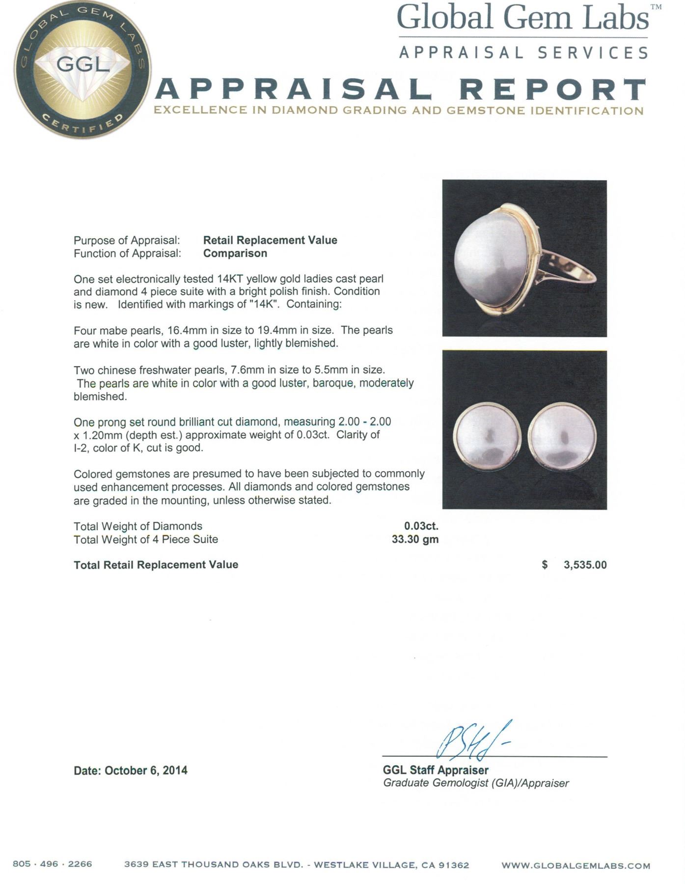 One set electronically tested 14KT yellow gold ladies cast pearl and diamond 4 piece suite with a bright polish finish. Identified with markings of "14K". Condition is new. Containing: Four mabe pearls, 16.4mm in size to 19.4mm in size. The pearls are white in color with a good luster, lightly blemished. Two Chinese freshwater pearls, 7.6mm in size to 5.5mm in size. The pearls are white in color with a good luster, baroque, moderately blemished. One prong set round brilliant cut diamond, measuring 2.00 - 2.00 x 1.20mm (depth est.) approximate weight of 0.03ct. Clarity: I-2. Color: K, Cut is Good. Colored gemstones are presumed to have been subjected to commonly used enhancement processes. All diamonds and colored gemstones are graded in the mounting, unless otherwise stated. Total Weight of Diamonds 0.03ct. Total Weight of 4 Piece Suite 33.30 grams. GGL Appraised.