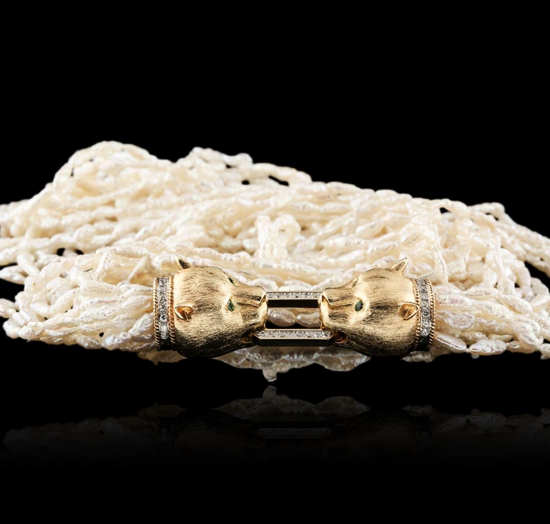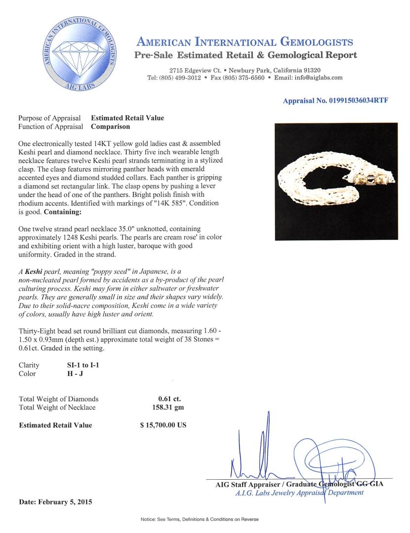 One electronically tested 14KT yellow gold ladies cast & assembled Keshi pearl and diamond necklace. Thirty five inch wearable length necklace features twelve Keshi pearl strands terminating in a stylized clasp. The clasp features mirroring panther heads with emerald accented eyes and diamond studded collars. Each panther is gripping a diamond set rectangular link. The clasp opens by pushing a lever under the head of one of the panthers. Bright polish finish with rhodium accents. Identified with markings of "14K 585". Condition is good. Containing: One twelve strand pearl necklace 35.0" unknotted, containing 124 keshi pearls, The pearls are cream rose' in color and exhibiting orient with a high luster, baroque with good uniformity Graded in the strand. A Keshi pearl, meaning "poppy seed" in Japanese, is a non-nucleated pearl formed by accidents as a by-product of the pearl culturing process. Keshi may form in either saltwater or freshwater pearls. They are generally small in size and their shapes vary widely. Due to their solid-nacre composition, Keshi come in a wide variety of colors, usually have high luster and orient. Thirty-Eight bead set round brilliant cut diamonds, measuring 1.60 - 1.50 x 0.93mm (depth est.) approximate total weight of 38 Stones = 0.61ct. Graded in the setting. Clarity: SI-1 to I-1. Color: H - J. Total Weight of Diamonds 0.61ct. Total Weight of Necklace158.31 grams. AIG Appraised at $15,700.00.