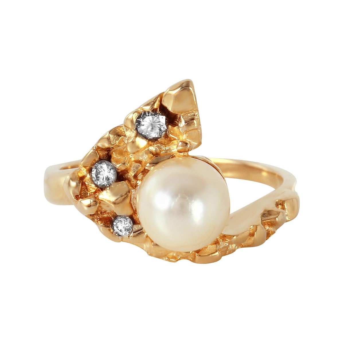 One stamped & tested 14KT yellow gold ladies pearl and diamond ring with a bright polish finish. Identified with markings of "14K". Condition is very good. Containing: One chinese freshwater pearl, 6.9mm in size. The pearl is white in color with a good luster, round, lightly blemished. Three prong set round brilliant cut diamonds, measuring 2.20 - 1.30 x 1.05mm (depth est.) approximate total weight of 3 Stones = 0.06ct. Clarity of SI, Color of J - K. Approximate Total Weight of Diamonds 0.06ct. Total Weight of Ring 4.24gm. Size 6.5. The descriptions listed should not be construed as an appraisal. The detail is provided as a guideline for color, clarity, weights and measurements to the best of our ability. We welcome inspections. WE SHIP WORLDWIDE!