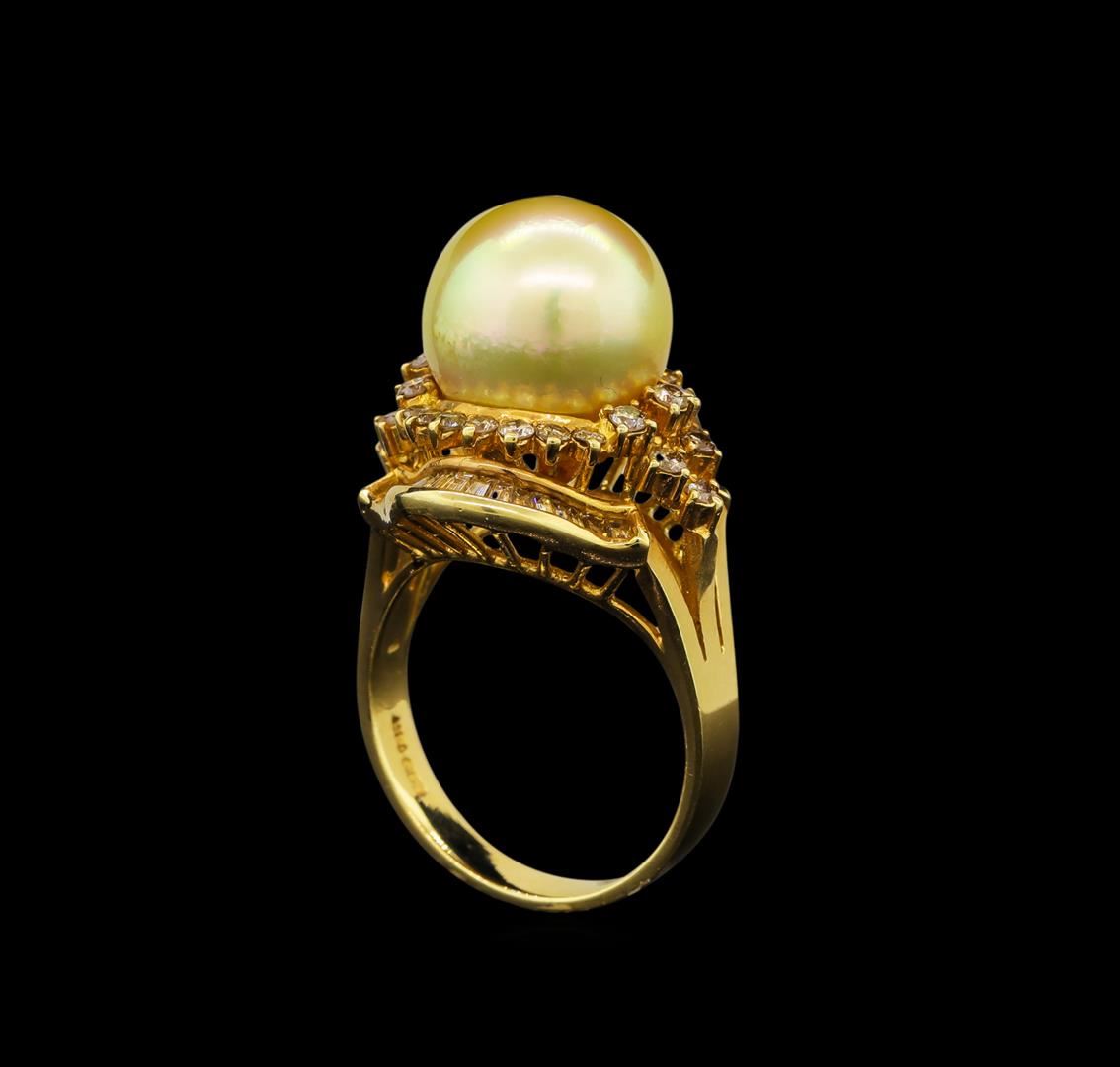 One electronically tested 14KT yellow gold ladies cast south sea cultured pearl & diamond ring with a bright polish finish. The featured south sea cultured pearl is set within a stylized diamond bezel supported by mirroring diamond ribbons, completed by a three millimeter wide band. Identified with markings of "14K 585". Condition is good. Containing: One south sea cultured pearl, 11.5mm in size. The pearl is golden in color with a high luster, thick nacre, all round, lightly spotted Graded in the setting. South Sea Cultured Pearls are farmed in the ocean waters throughout Australia, the Philippines, Indonesia, and the southern coast of China. Australia's main culturing industry is located near the city of Broome, in the northwest, on the Kimberley coast. South Sea cultured pearls form in the Pinctada Maxima oyster, the world's largest (up to 34cm) pearl cultivating oyster. The Indian & Pacific Ocean, the Java & the South China Sea, are the native waters of the Pinctada Maxima oyster. There are two varieties of the Pinctada Maxima: the Gold Lipped oyster which produces the golden color pearls, and the Silver Lipped oyster which produces white color pearls. The South Sea cultured pearl takes from about two to three years to grow. It is produced by inserting a large bead into the oyster when it is about two years old. The South Sea pearl nacre has a unique satiny appearance, due partly to the fast moving and clean waters on the South Seas. Twenty-Six prong set round brilliant cut diamonds, measuring 1.80 - 1.70 x 1.05mm (depth est.) approximate total weight of 26 Stones = 0.61ct. Graded in the setting. Clarity: SI-1 to I-1. Color: J - L Thirty-Four channel set baguette cut (tapered) diamonds, measuring from 1.70 x 1.00 x 0.70mm (depth est.) to 2.10 x 1.40 x 0.98mm (depth est.) approximate total weight of 34 Stones = 0.60 ct. Graded in the setting. Clarity: VS-1 to SI-1. Color: I - K. Total Weight of Diamonds 1.21ct. Total Weight of Ring 8.13 grams. AIG Appraised.