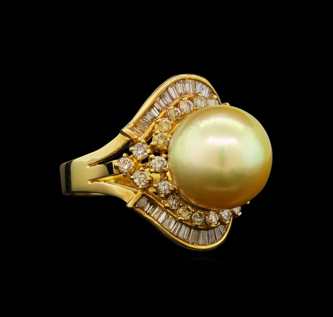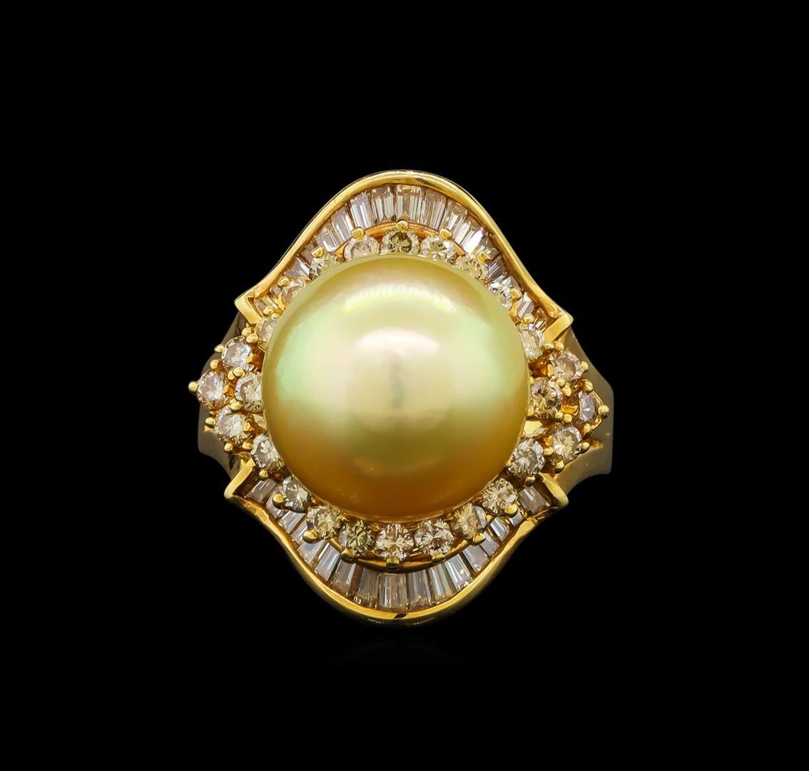 One electronically tested 14KT yellow gold ladies cast south sea cultured pearl & diamond ring with a bright polish finish. The featured south sea cultured pearl is set within a stylized diamond bezel supported by mirroring diamond ribbons, completed by a three millimeter wide band. Identified with markings of "14K 585". Condition is good. Containing: One south sea cultured pearl, 11.5mm in size. The pearl is golden in color with a high luster, thick nacre, all round, lightly spotted Graded in the setting. South Sea Cultured Pearls are farmed in the ocean waters throughout Australia, the Philippines, Indonesia, and the southern coast of China. Australia's main culturing industry is located near the city of Broome, in the northwest, on the Kimberley coast. South Sea cultured pearls form in the Pinctada Maxima oyster, the world's largest (up to 34cm) pearl cultivating oyster. The Indian & Pacific Ocean, the Java & the South China Sea, are the native waters of the Pinctada Maxima oyster. There are two varieties of the Pinctada Maxima: the Gold Lipped oyster which produces the golden color pearls, and the Silver Lipped oyster which produces white color pearls. The South Sea cultured pearl takes from about two to three years to grow. It is produced by inserting a large bead into the oyster when it is about two years old. The South Sea pearl nacre has a unique satiny appearance, due partly to the fast moving and clean waters on the South Seas. Twenty-Six prong set round brilliant cut diamonds, measuring 1.80 - 1.70 x 1.05mm (depth est.) approximate total weight of 26 Stones = 0.61ct. Graded in the setting. Clarity: SI-1 to I-1. Color: J - L Thirty-Four channel set baguette cut (tapered) diamonds, measuring from 1.70 x 1.00 x 0.70mm (depth est.) to 2.10 x 1.40 x 0.98mm (depth est.) approximate total weight of 34 Stones = 0.60 ct. Graded in the setting. Clarity: VS-1 to SI-1. Color: I - K. Total Weight of Diamonds 1.21ct. Total Weight of Ring 8.13 grams. AIG Appraised.