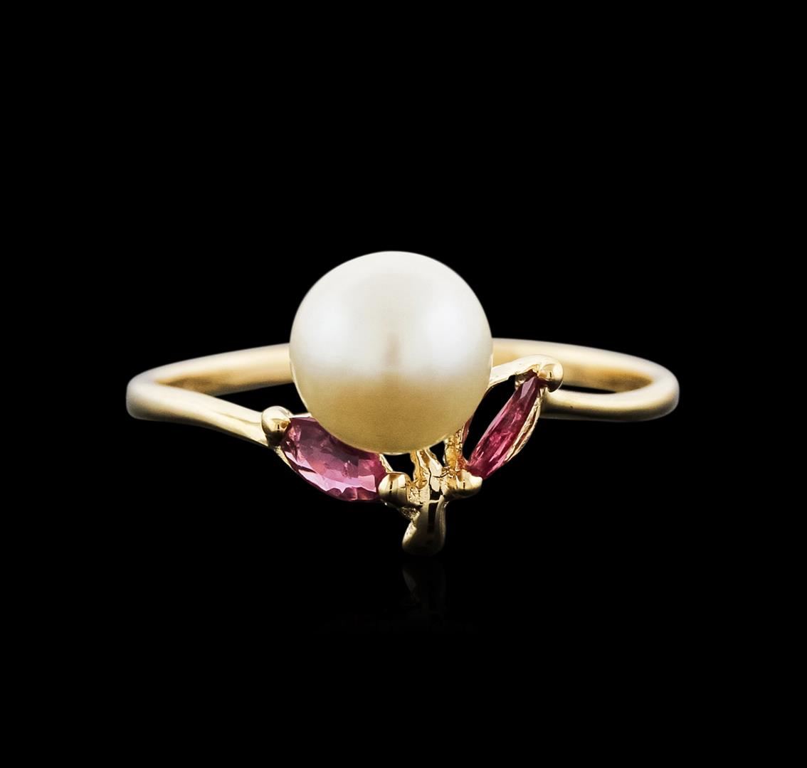 One ring featuring: 14KT yellow gold weighing 1.40 grams containing one pearl and two pink topaz with a total weight of 0.24ct.