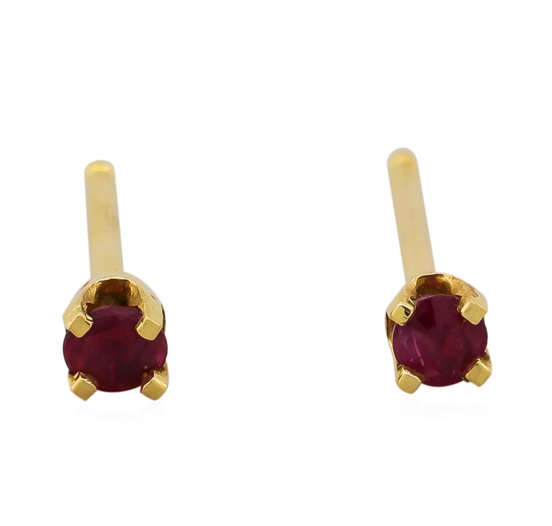 These earrings are made of 14KT Yellow gold, have stud backs, two round cut rubies.