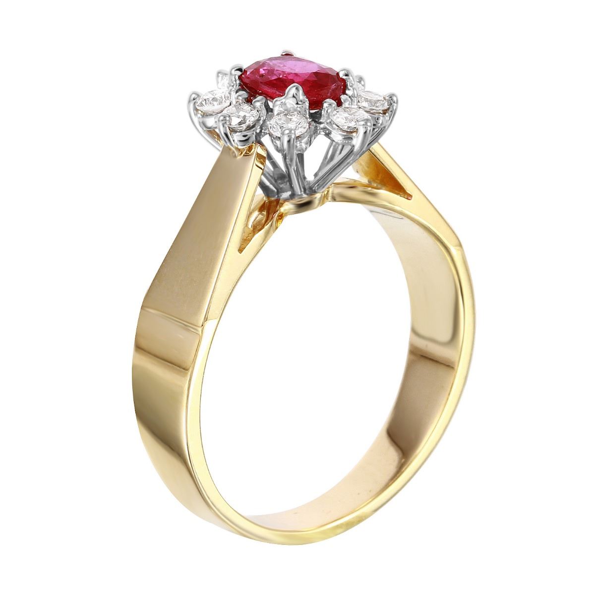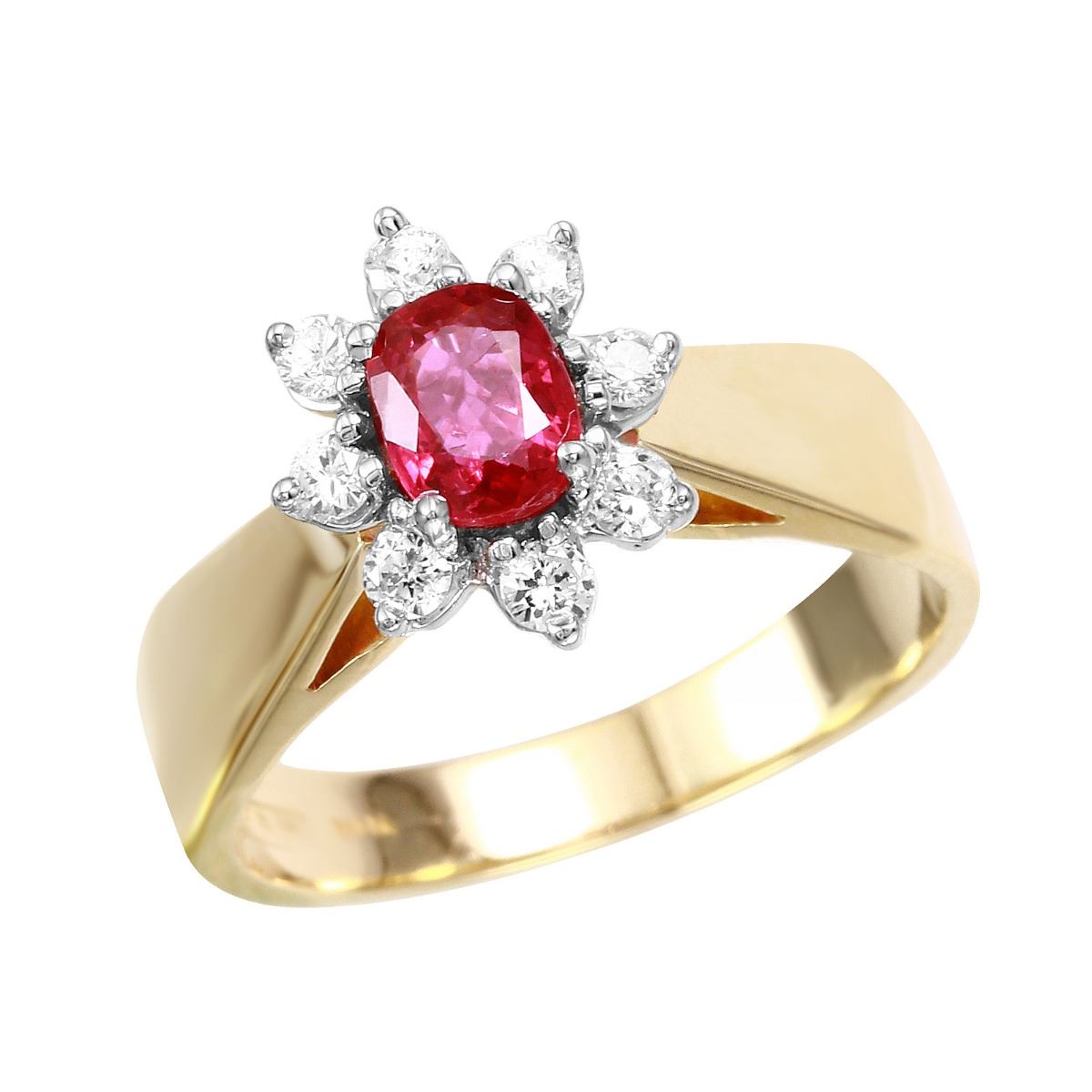 One stamped & tested 14KT yellow gold ladies cast ruby and diamond ring with a bright polish finish. Size 6.5 (sizable). Engraved "Canada" inside the shank. Trademark is P&H. Identified with markings of "14K". Condition is excellent. Containing: One prong set oval modified brilliant cut natural ruby, measuring 5.50 x 4.80 x 3.50mm, approximate weight of 0.78ct., clarity is slightly included, type II, medium, moderately strong, slightly purplish red color, cut is good. Eight prong set round brilliant cut diamonds, measuring 2.00 - 2.00 x 1.20mm (depth est.) approximate total weight of 8 Stones = 0.25ct. Clarity: VS-1 to VS-2. Color: G - H, Cut is Very Good. Approximate Total Weight of Colored Stones 0.78ct. Approximate Total Weight of Diamonds 0.25ct. Total Weight of Ring 4.20gm. The descriptions listed should not be construed as an appraisal. The detail is provided as a guideline for color, clarity, weights and measurements to the best of our ability. We welcome inspections. WE SHIP WORLDWIDE!