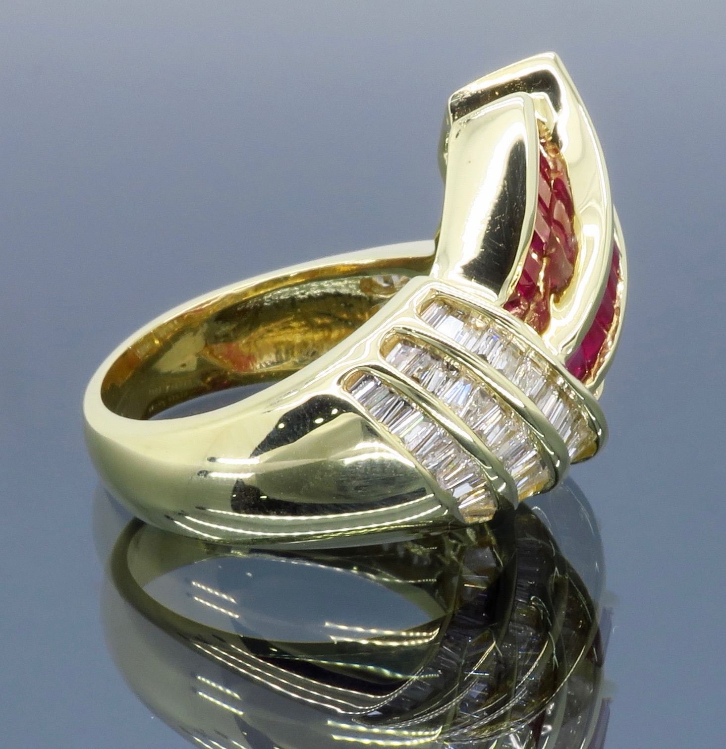 One 14KT Yellow Gold Ruby and Diamond Ring. Tapered Baguette Diamonds with a total weight of 0.75cts with a color of I-J and clarity of VS2-SI1. Total weight of this ring is 10.3 grams.