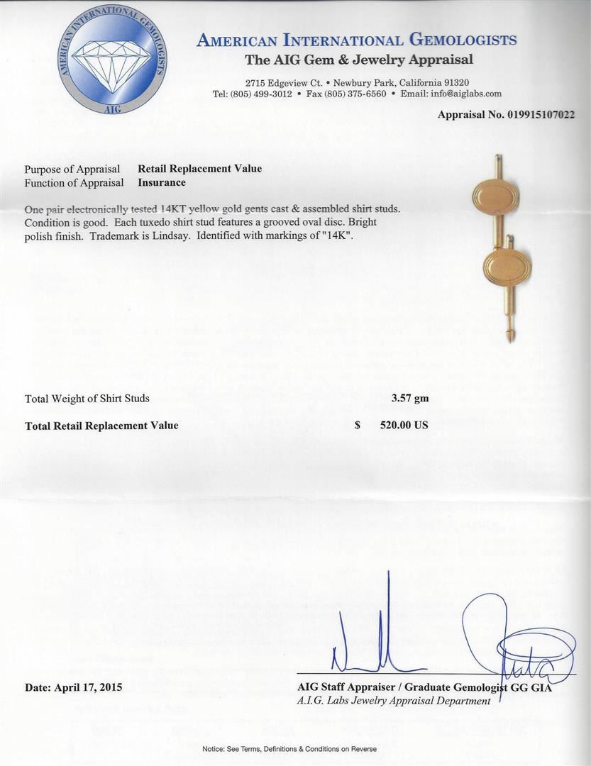 One pair electronically tested 14KT yellow gold gents cast & assembled shirt studs. Condition is good. Each tuxedo shirt stud features a grooved oval disc. Bright polish finish. Trademark is Lindsay. Identified with markings of "14K". Total Weight of Shirt Studs: 3.57 gm. AIG Appraised at $520.00.