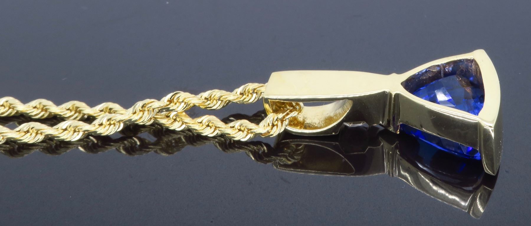 One 14KT Yellow Gold Tanzanite and Diamond Pendant with Chain. Tanzanite stone with a measurement of 13.72mm x 13.60mm. (1) round Diamond with a total weight of 0.30cts. Total weight of this pendant with chain is 26.6 grams. Length of this chain is 22 inches.