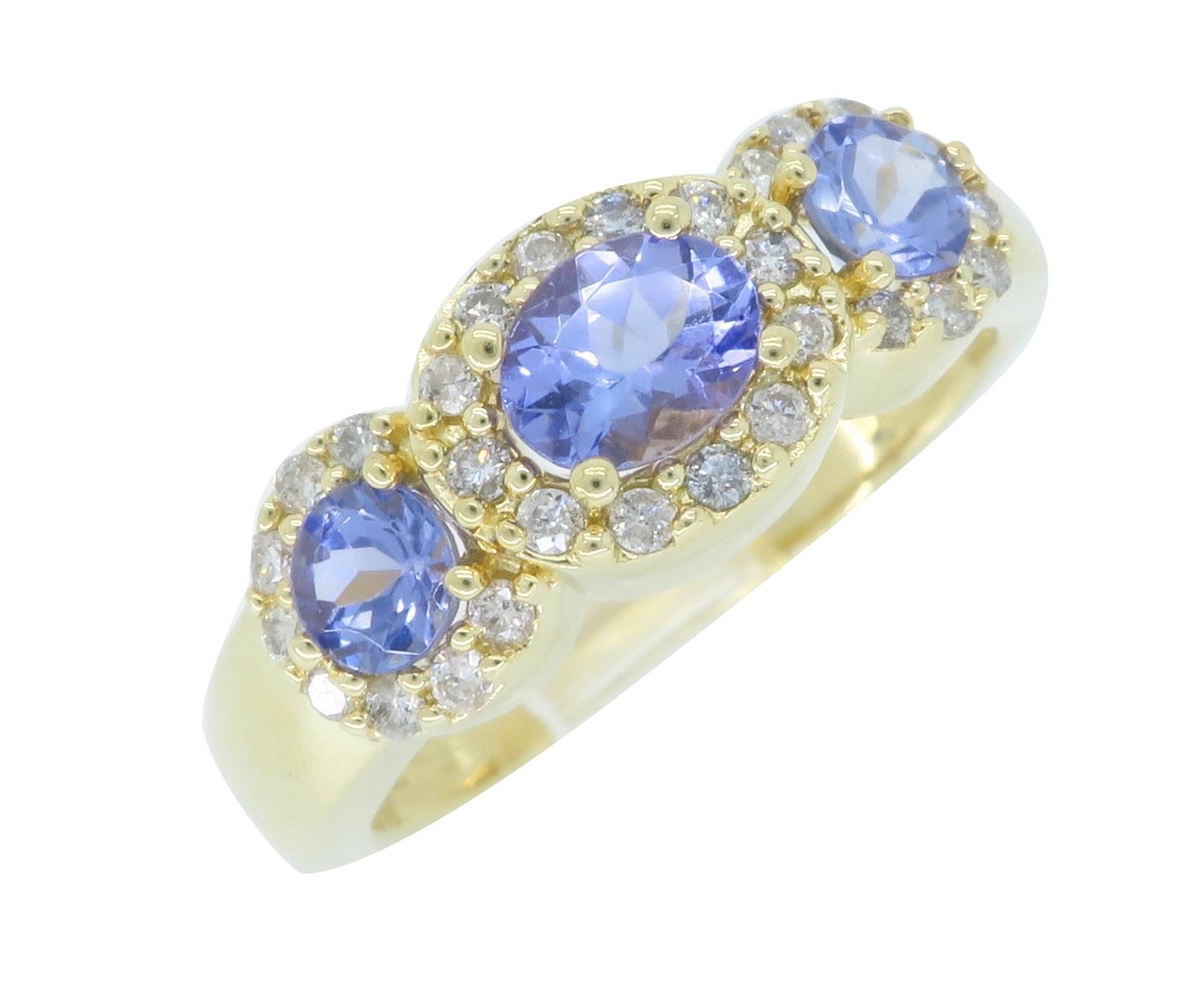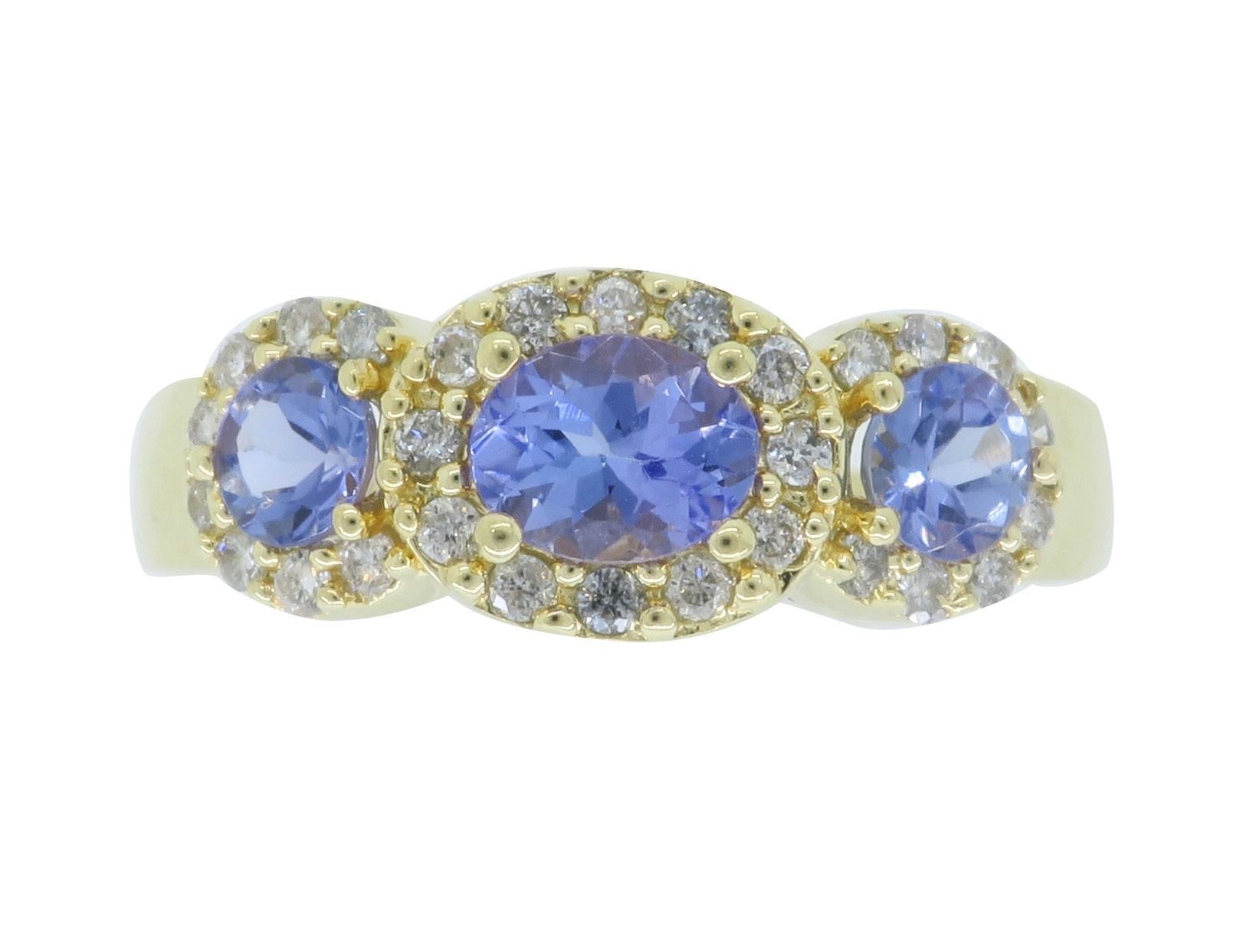 One 14KT Yellow Gold Tanzanite and Diamond Ring. (1) oval Tanzanite stone measuring 4.93mm x 3.5mm. (2) round tanzanite stones measuring 3.5mm. Round Diamonds with a total weight of 0.28cts. Total weight of this ring is 4.5 grams. Ring size is 6.