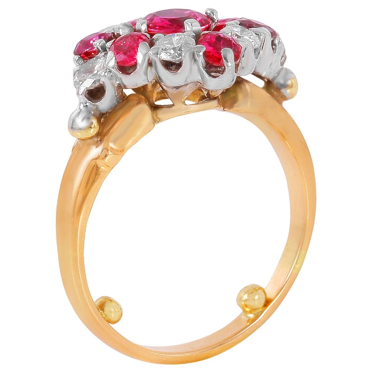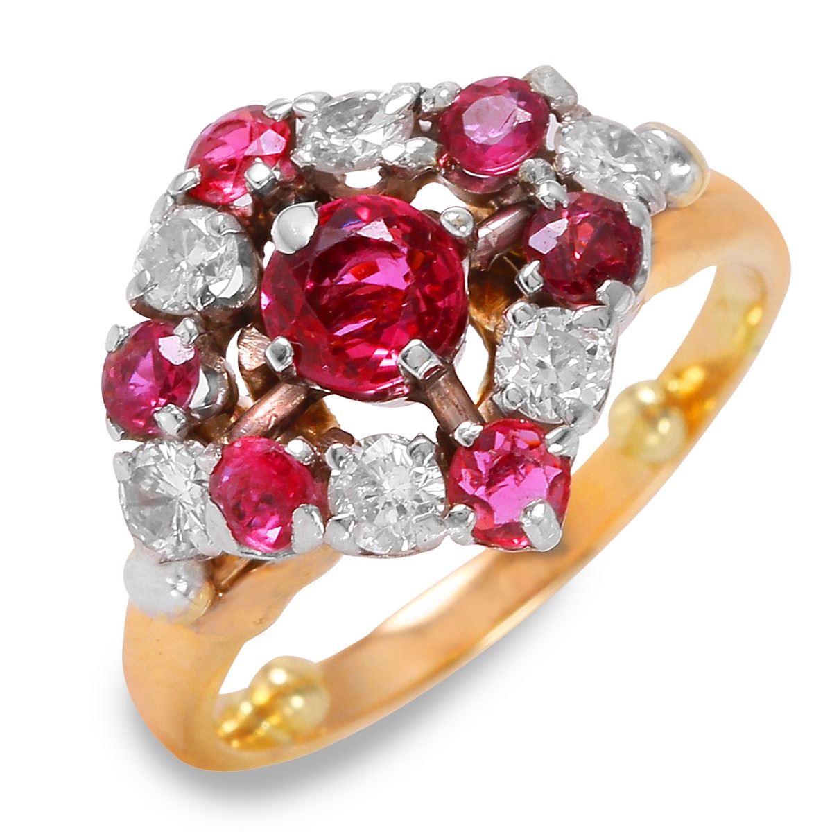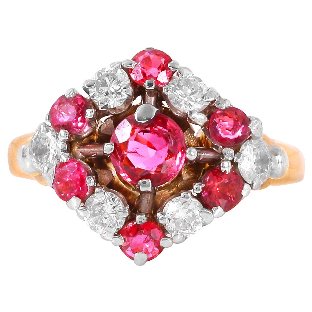 One electronically tested 14KT yellow gold lady's hand made vintage style ruby and diamond ring with a bright polish finish. Condition is very good. Containing: One prong set round modified brilliant cut natural ruby, measuring 5.00 - 5.00 x 3.25 mm, approximate weight of 0.33ct., clarity is slightly included, medium, moderately strong, purple red color, cut is good. Six prong set round modified brilliant cut natural rubies, measuring 3.00 - 3.00 x 1.95 mm, approximate total weight of 0.84ct., clarity is moderately included, type II, medium, moderately strong, strongly purplish red color, cut is good. Six prong set round brilliant cut diamonds, measuring 3.00 - 3.00 x 1.80mm (depth est.) approximate total weight of 6 Stones = 0.59ct. Clarity: SI-2. Color: J, Cut is Good. Approximate Total Weight of Colored Stones 1.16ct. Approximate Total Weight of Diamonds 0.59ct. Total Weight of Ring 6.10gm. Ring Size 5.25. The descriptions listed should not be construed as an appraisal. The detail is provided as a guideline for color, clarity, weights and measurements to the best of our ability. We welcome inspections. WE SHIP WORLDWIDE!