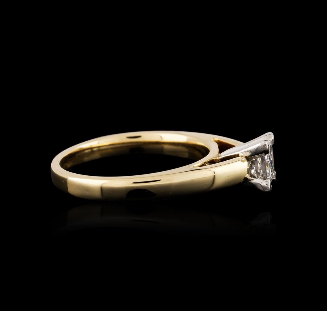 One electronically tested 14KT & platinum yellow gold ladies cast diamond solitaire ring with a bright polish finish. Identified with markings of "14K PLAT". Condition is new. Containing: One prong set princess cut diamond, measuring 4.60 x 4.50 x 3.38mm (depth est.) approximate weight of 0.57ct. Clarity: SI-1. Color: J, Cut is Good. All diamonds are graded in the mounting, unless otherwise stated. Total Weight of Diamonds 0.57ct. Total Weight of Solitaire Ring 5.10 grams. GGL Appraised at $3,100.00.