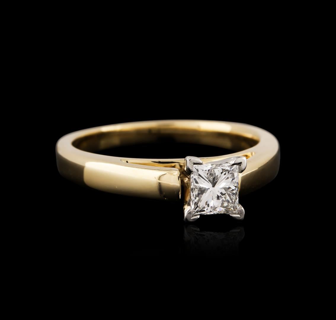 One electronically tested 14KT & platinum yellow gold ladies cast diamond solitaire ring with a bright polish finish. Identified with markings of "14K PLAT". Condition is new. Containing: One prong set princess cut diamond, measuring 4.60 x 4.50 x 3.38mm (depth est.) approximate weight of 0.57ct. Clarity: SI-1. Color: J, Cut is Good. All diamonds are graded in the mounting, unless otherwise stated. Total Weight of Diamonds 0.57ct. Total Weight of Solitaire Ring 5.10 grams. GGL Appraised at $3,100.00.