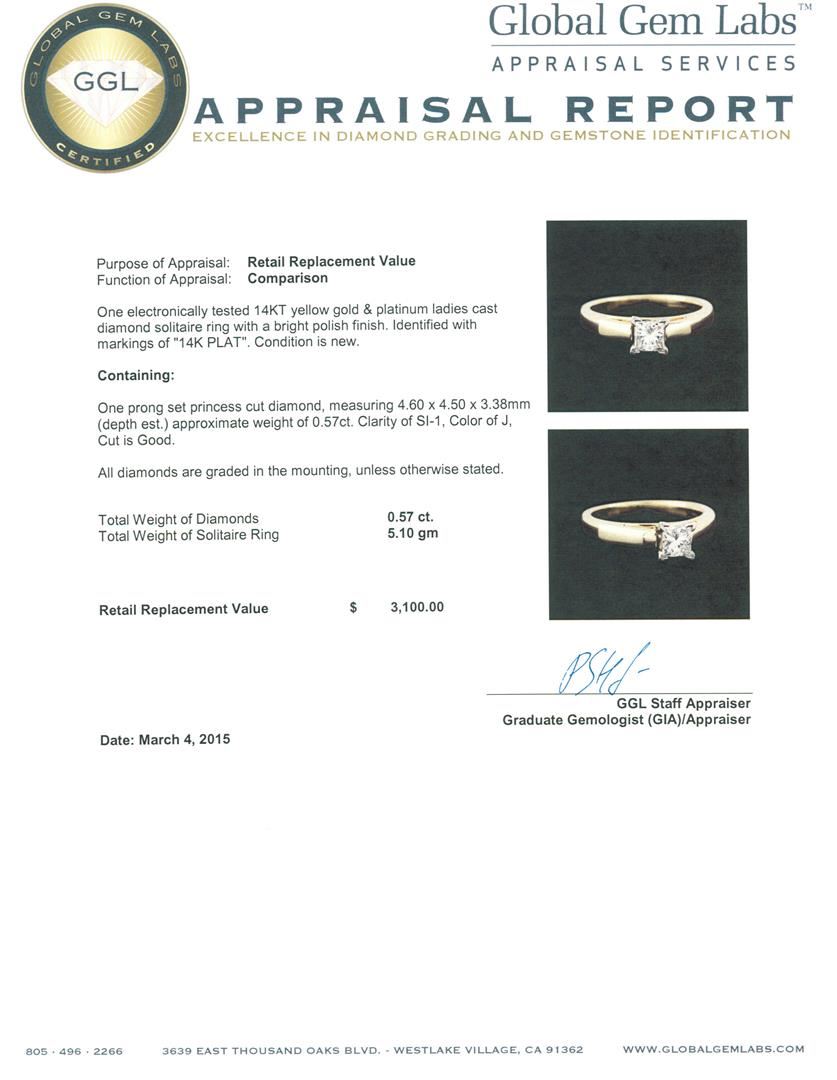 One electronically tested 14KT & platinum yellow gold ladies cast diamond solitaire ring with a bright polish finish. Identified with markings of "14K PLAT". Condition is new. Containing: One prong set princess cut diamond, measuring 4.60 x 4.50 x 3.38mm (depth est.) approximate weight of 0.57ct. Clarity: SI-1. Color: J, Cut is Good. All diamonds are graded in the mounting, unless otherwise stated. Total Weight of Diamonds 0.57ct. Total Weight of Solitaire Ring 5.10 grams. GGL Appraised at $3,100.00.