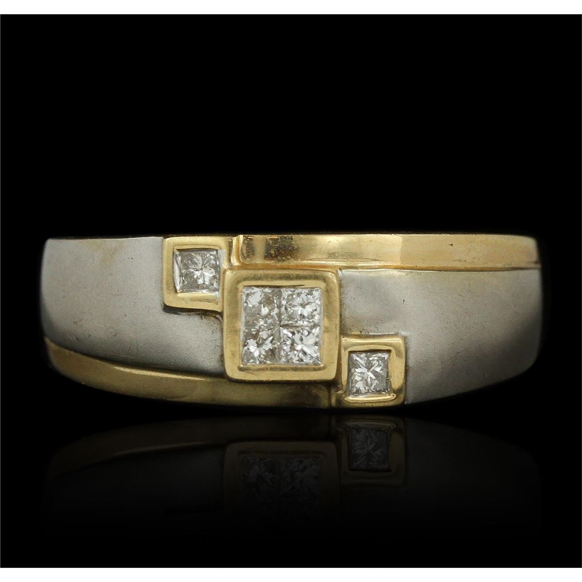 One electronically tested 14KT yellow and white gold man's combination cast & assembled ring with a bright polish finish. Condition is very good. Identified with markings of "14K". Containing: Six invisible set princess cut diamonds, measuring 1.80 x 1.80 x 1.35mm (depth est.) approximate. Total Weight of 6 Stones = 0.22ct. Clarity: VS-2 to SI-1. Color: I - J, Cut is Very Good. Total Weight of Diamonds 0.22ct. Total Weight of Ring 6.00gm. GGL Appraised at $3,010.00.