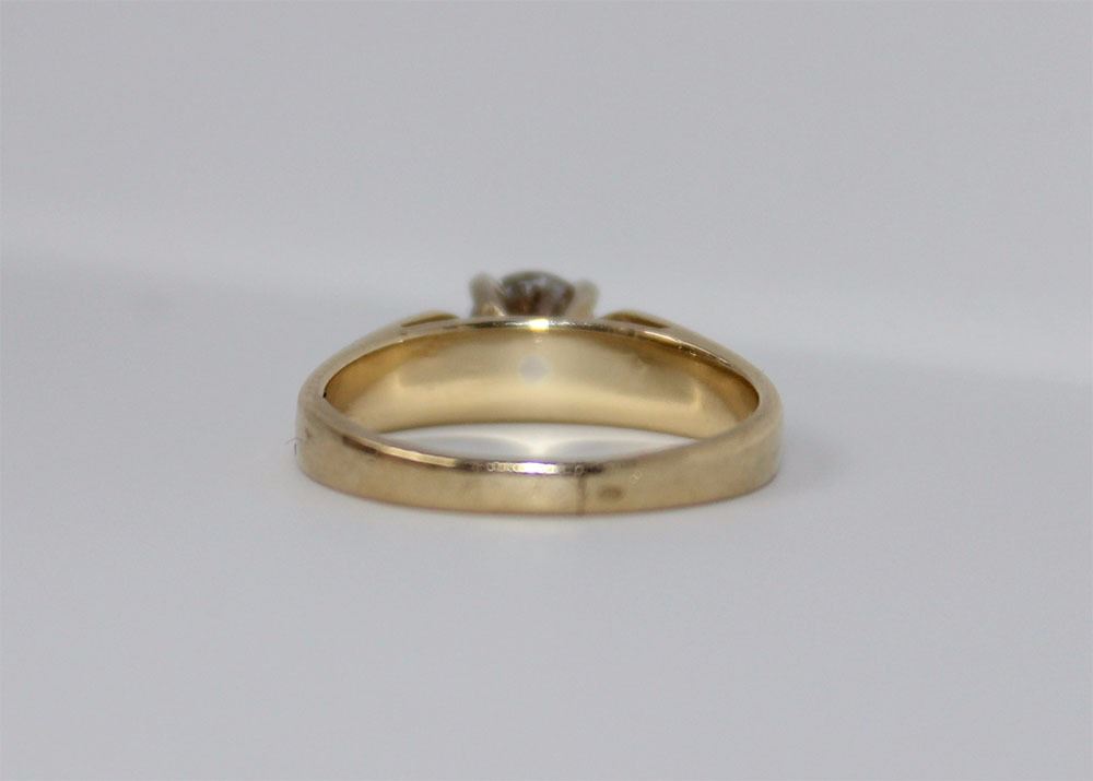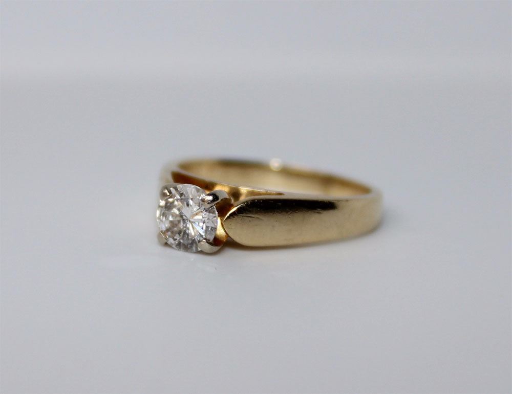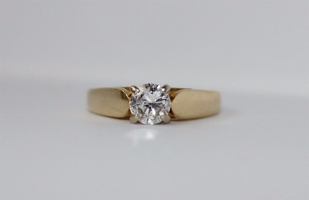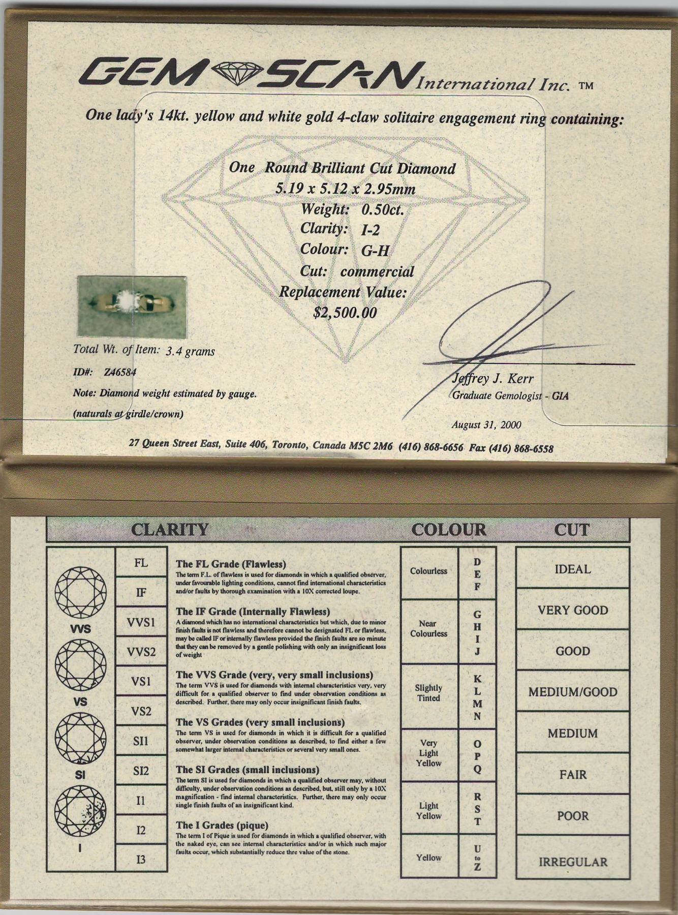 One lady's 14KT yellow and white gold 4-claw solitaire engagement ring containing one round brilliant cut diamond, measuring 5.19 x 5.12 x 2.95mm (est. by gauge) weight of 0.50ct. Clarity of I2, Colour of G-H, Cut is commercial. Aprraised at $2500.00CAD by GEM SCAN International Inc.