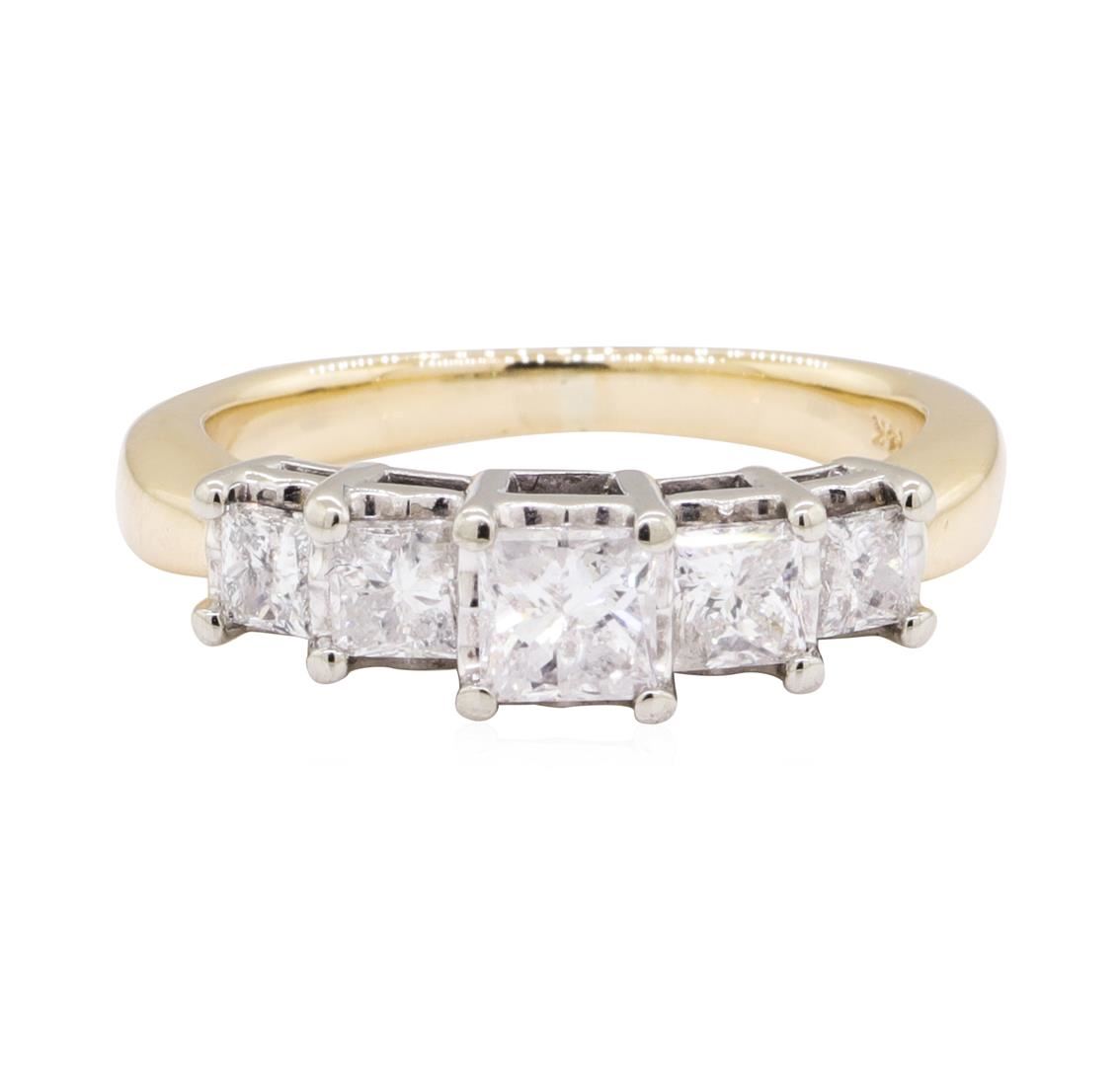 One electronically tested 14KT yellow and white gold lady's combination cast & assembled fashion ring with a five stone motif with a bright polish finish. The featured lady's ring has a shank measuring 2.14 millimeters wide. Identified with markings of '14K'. Condition is new, good workmanship. Containing: One prong set princess cut diamond, measuring 4.00 x 3.97 x 2.80mm (depth est.) approximate weight of 0.37ct. Graded in the setting. Color H - I, Clarity I-2, Cut Good Two prong set princess cut diamonds, measuring 3.25 x 3.20 x 2.35mm (depth est.) approximate total weight of 2 Stones = 0.40ct. Graded in the setting. Color H - I, Clarity I-1, Cut Good Two prong set princess cut diamonds, measuring 2.72 x 2.69 x 1.90mm (depth est.) approximate total weight of 2 Stones = 0.24ct. Graded in the setting. Color H - I, Clarity I-1 to I-2, Cut Good. Total Weight of Diamonds 1.01ct. Total Weight of Ring 4.50gm. GAS Appraised.
