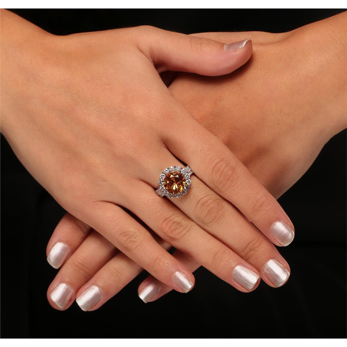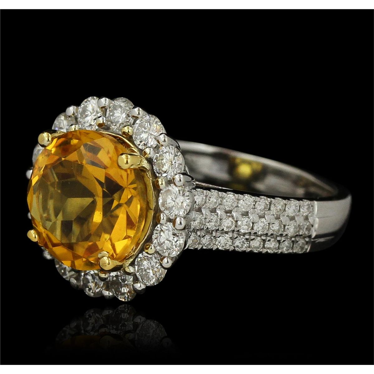 One electronically tested 14KT yellow and white gold Ladies combination cast & assembled ring with a bright polish finish. Condition is new. Identified with markings of "14K". Containing: Forty-Eight prong set round brilliant cut diamonds, measuring 1.00 - 1.00 x 0.60mm (depth est.) approximate. Total Weight of 48 Stones = 0.17ct. Clarity: I-1 to I-2. Color: H - I, Cut is Good. Fourteen prong set round brilliant cut diamonds, measuring 2.50 - 2.50 x 1.50mm (depth est.) approximate. Total Weight of 14 Stones = 1.30ct. Clarity: I-1 to I-2. Color: I - J, Cut is Good. One prong set round modified brilliant cut natural citrine quartz, measuring 10.10 - 10.00 x 6.03 mm, exact weight 3.71ct., clarity is eye clean, type I, medium light, moderately strong, orangy yellow color, (GIA oY 4/4), cut is very good. Colored gemstones are presumed to have been subjected to commonly used color/clarity enhancement processes. Total Weight of Colored Stones 3.71ct. Total Weight of Diamonds 1.47ct. Total Weight of Ring 6.30 grams. GGL Appraised at $4,985.00.