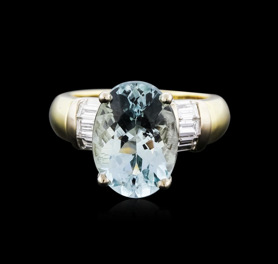 One ring featuring: 14KT yellow and white gold weighing 10.60 grams containing one oval cut aquamarine weighing 4.93ct and baguette cut diamonds weighing a total of 0.46ct.
