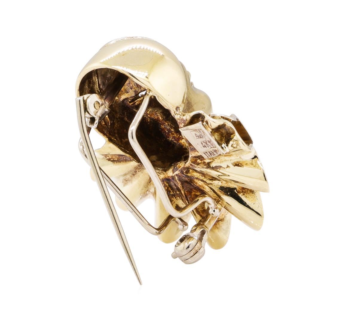 One crying harlequin motif pin/pendant featuring: 14KT yellow and white gold weighing 12.2 grams.