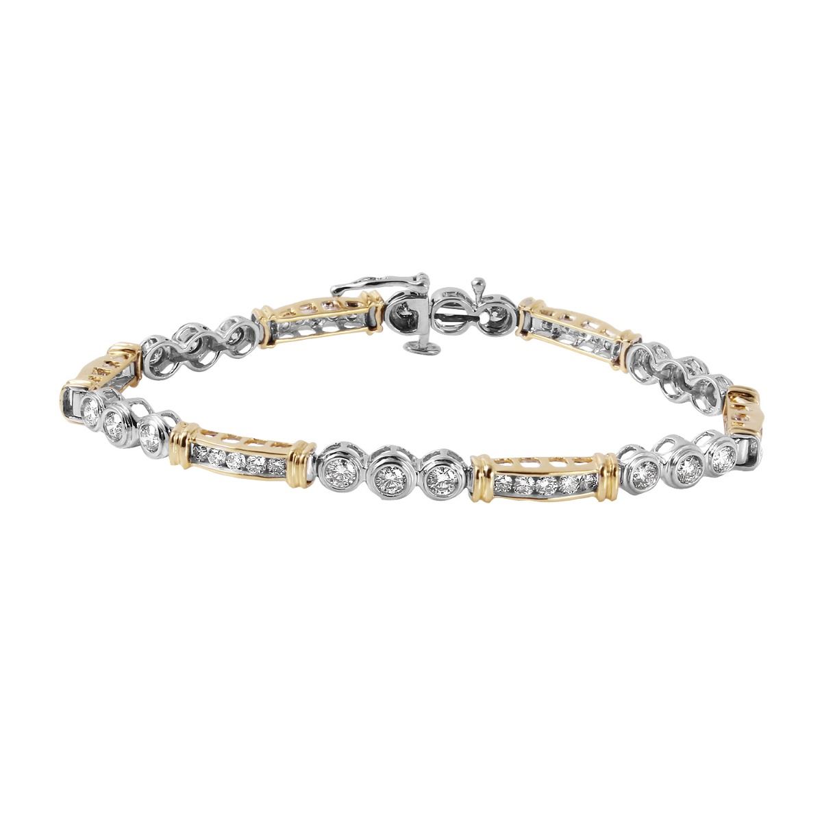 One stamped & tested 14KT yellow and white gold ladies cast diamond bracelet with a hidden box clasp with safety closer with a bright polish finish. Measurements: 7" in length. Identified with markings of "14K". Condition is very good. Containing: Eighteen bezel set round brilliant cut diamonds, measuring 2.50 - 2.50 x 1.50mm (depth est.) approximate total weight of 18 Stones = 1.03ct. Clarity: SI-1 to I-1. Color: H - I, Cut is Very Good. Thirty channel set round brilliant cut diamonds, measuring 2.30 - 2.30 x 1.38mm (depth est.) approximate total weight of 30 Stones = 1.34ct. Clarity: SI-1 to SI-2. Color: I - J, Cut is Very Good. Approximate Total Weight of Diamonds 2.36ct. Total Weight of Bracelet 12.70gm. The descriptions listed should not be construed as an appraisal. The detail is provided as a guideline for color, clarity, weights and measurements to the best of our ability. We welcome inspections. WE SHIP WORLDWIDE!