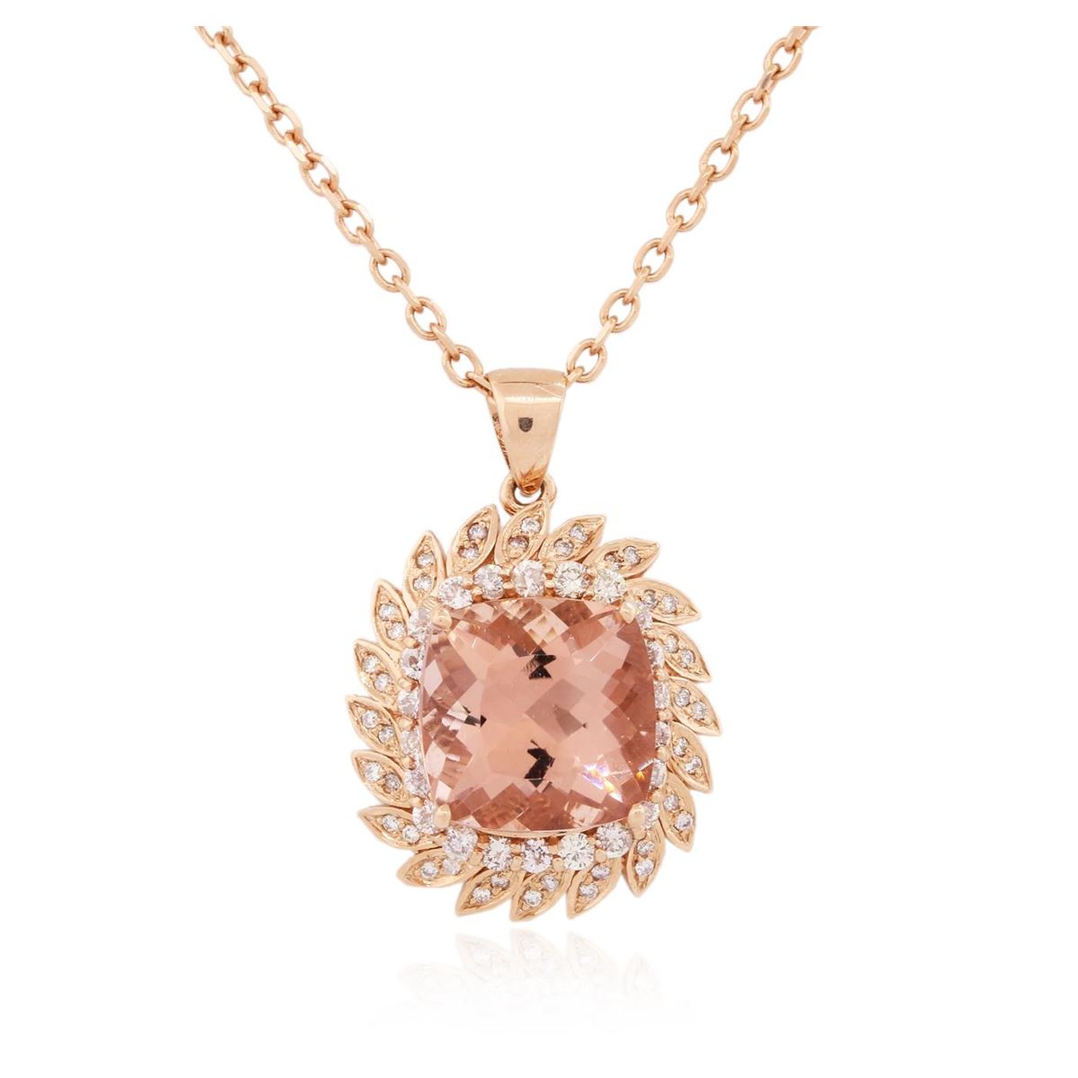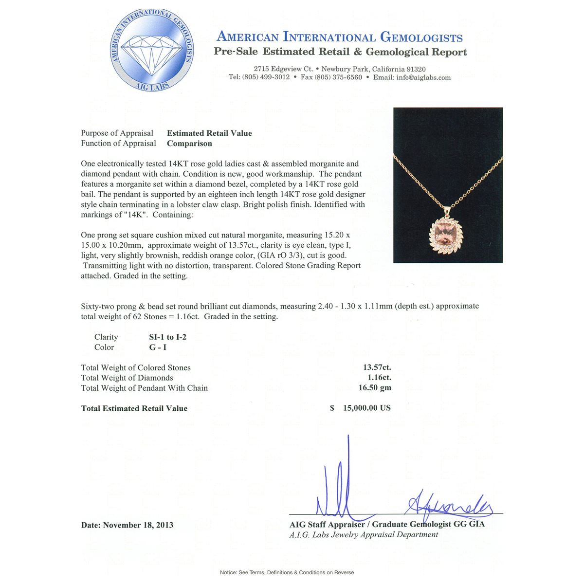 One electronically tested 14KT rose gold ladies cast & assembled morganite and diamond pendant with chain. Condition is new, good workmanship. The pendant features a morganite set within a diamond bezel, completed by a 14KT rose gold bail. The pendant is supported by an eighteen inch length 14KT rose gold designer style chain terminating in a lobster claw clasp. Bright polish finish. Identified with markings of "14K". Containing: One prong set square cushion mixed cut natural morganite, measuring 15.20 x 15.00 x 10.20mm, approximate weight of 13.57ct., clarity is eye clean, type I, light, very slightly brownish, reddish orange color, (GIA r0 3/3), cut is good. Transmitting light with no distortion, transparent. Colored Stone Grading Report attached. Graded in the setting. Sixty-two prong & bead set round brilliant cut diamonds, measuring 2.40 - 1.30 x 1.11mm (depth est.) approximate total weight of 62 Stones = 1.16ct. Graded in the setting. Clarity SI-1 to I-2. Color G - I. Total Weight of Colored Stones 13.57ct. Total Weight of Diamonds 1.16ct. Total Weight of Pendant With Chain 16.50gm. AIG Appraised at $15,000.00.