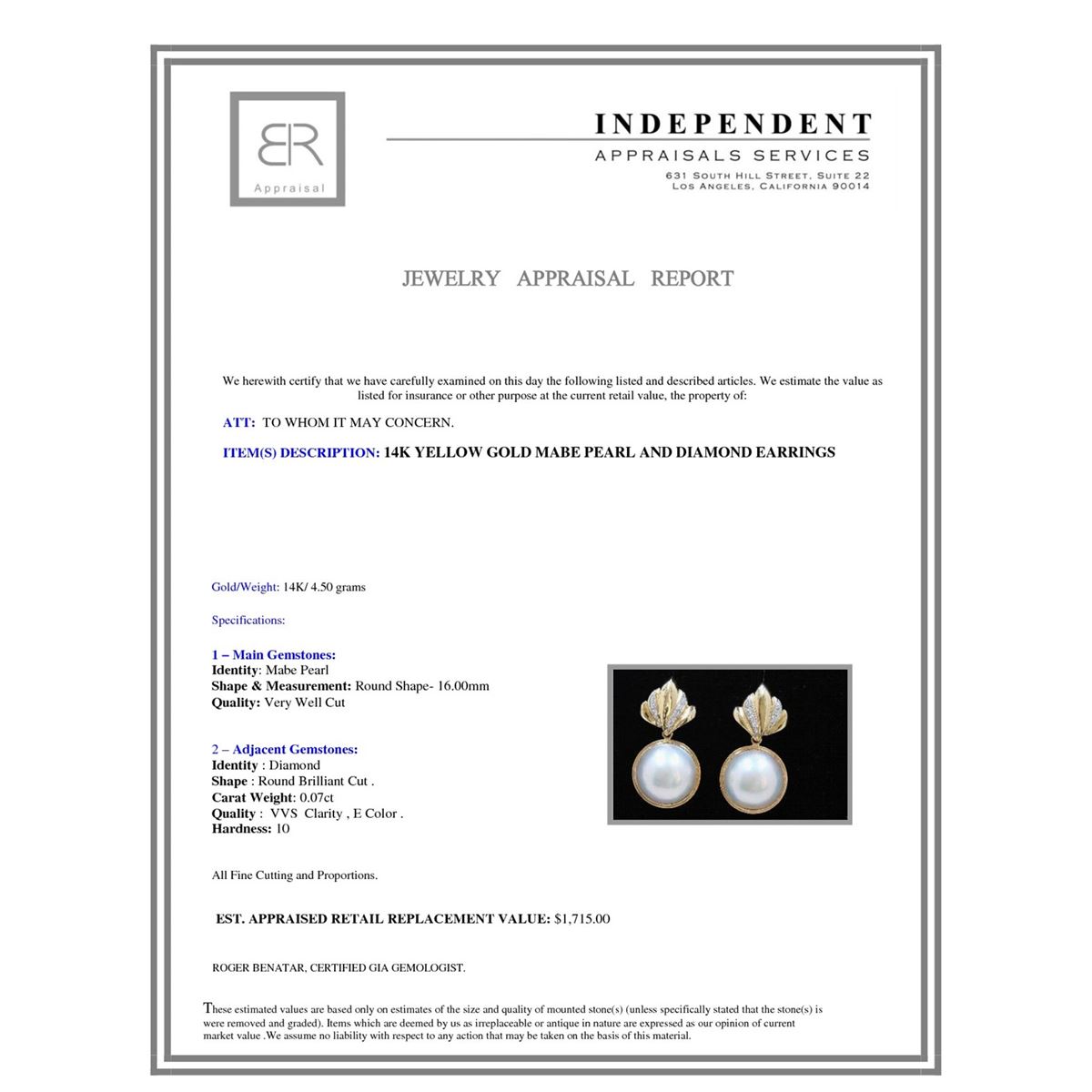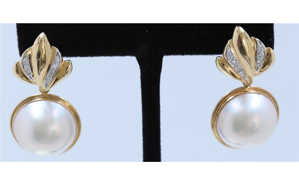 14KY/G MABE PEARLD AND DIAMOND EARRINGS/4.5 GRAMS/DIAMOND 0.07CT/PEARL 16.00MM APPROX