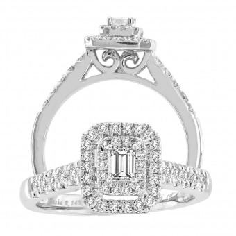 14kt White Gold solataire Ring with a Emerald Cut Baugette Diamond in the Center with a double "halo" around the Diamond with Diamonds Half way on the band Shear Prong Setting .