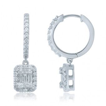 14kt Diamond Earring with Full Cut Round Diamonds on the huggie hoop and a Dangling "Halo" with Emerald Cut Baugettes in the center with round Diamonds around .