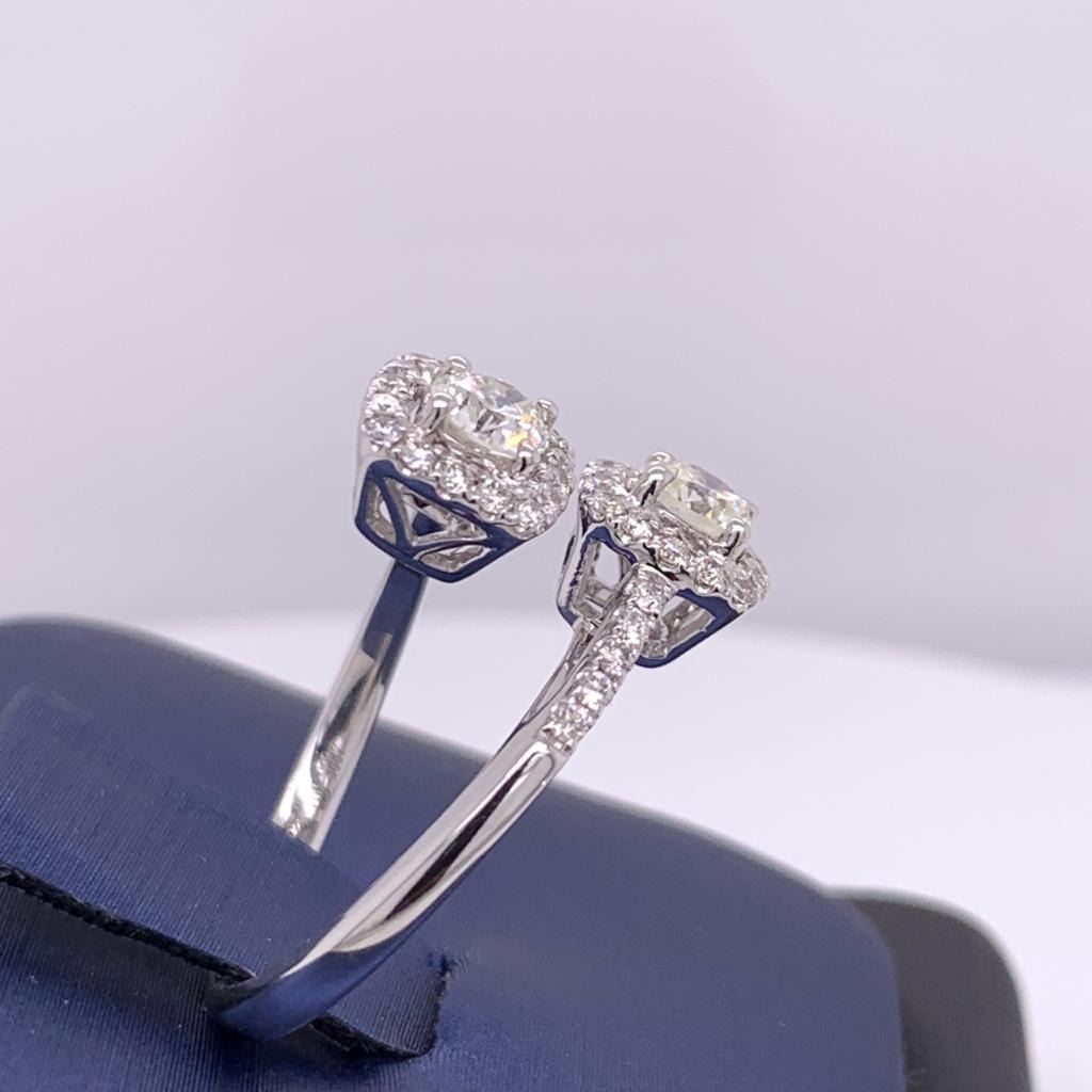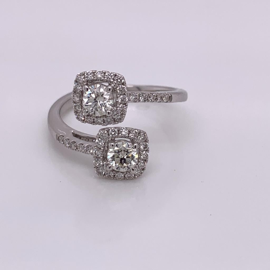 14Kt White Gold Ring. Criss Cross Natural Diamonds Ring. With 2 Full Cut Round Brilliant Cut Diamonds, Color - I-J, Clarity - Vs2-Si1, Off Set On Either Side With Full Cut Round Brilliant Cut Diamonds Set In A Double Cushion "Halo" Setting And 5 Diamonds On Either Side On The Band. Color - H-I, Clarity - Si1-Si2. Weight - 3.8 Grams. , 14K White Gold , Natural Diamonds , Center 2 Rds 0.61Ct Sides Rds 0.35Ct , Size 7 , Free Sizing Upto 2 Sizes Up Or Down , New From Manufacture.