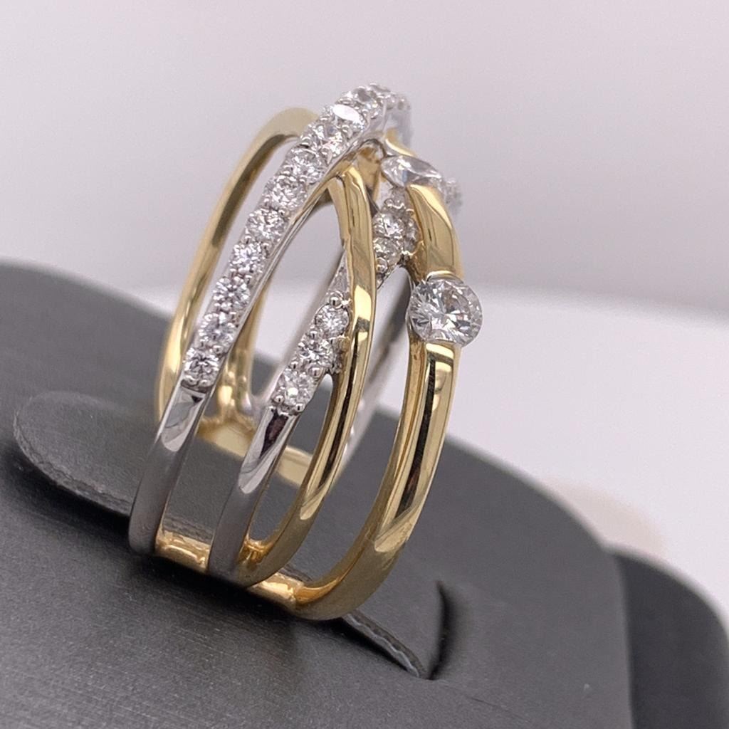 14Kt Yellow & White Gold Ring. With Full Cut Round Brilliant Cut Diamonds Set In A Channel And Prong Setting In A Fancy 4 Row Ring.